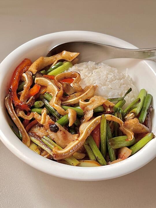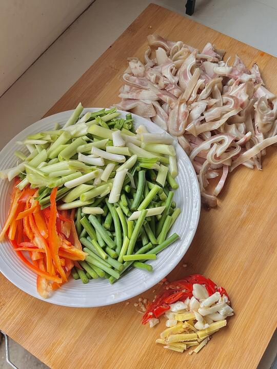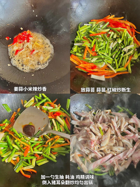 每到过年必吃的一道菜,蒜苔炒猪耳朵 脆脆的又入味,好香 好下饭! 食材:熟猪耳朵 红辣椒 小米辣 蒜苗 蒜苔 姜蒜 做法: 1️⃣锅中油热放姜蒜小米辣炒香 放蒜苔 红辣椒 蒜苗翻炒均匀 2️⃣放生抽 耗油鸡精翻炒均匀倒入猪耳朵翻炒2分钟入味出锅(卤好的猪耳朵 炒菜不需要放盐 味道刚好) 简单下饭快试试吧~