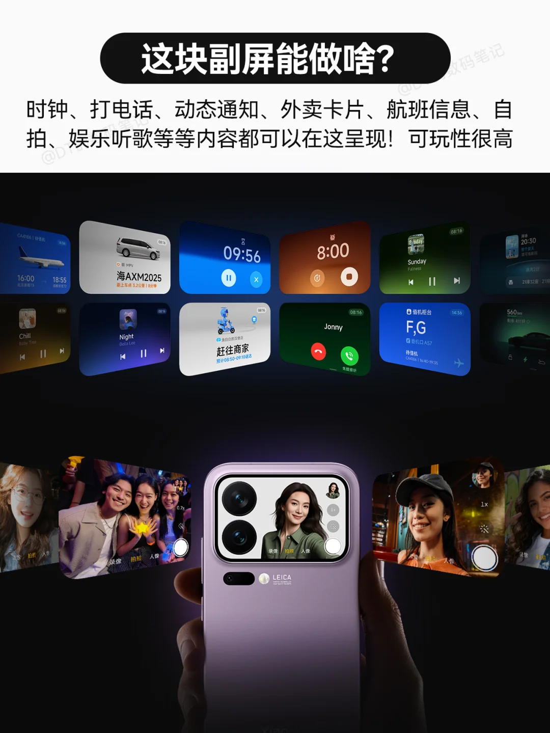 屏幕:背面增加了一块2.7英寸副屏!120Hz的高刷、3500nit的峰值亮度,技术参数可以说是与正面一致,具备时钟、动态通知、操控卡片、自拍显示等等功能,可玩性高