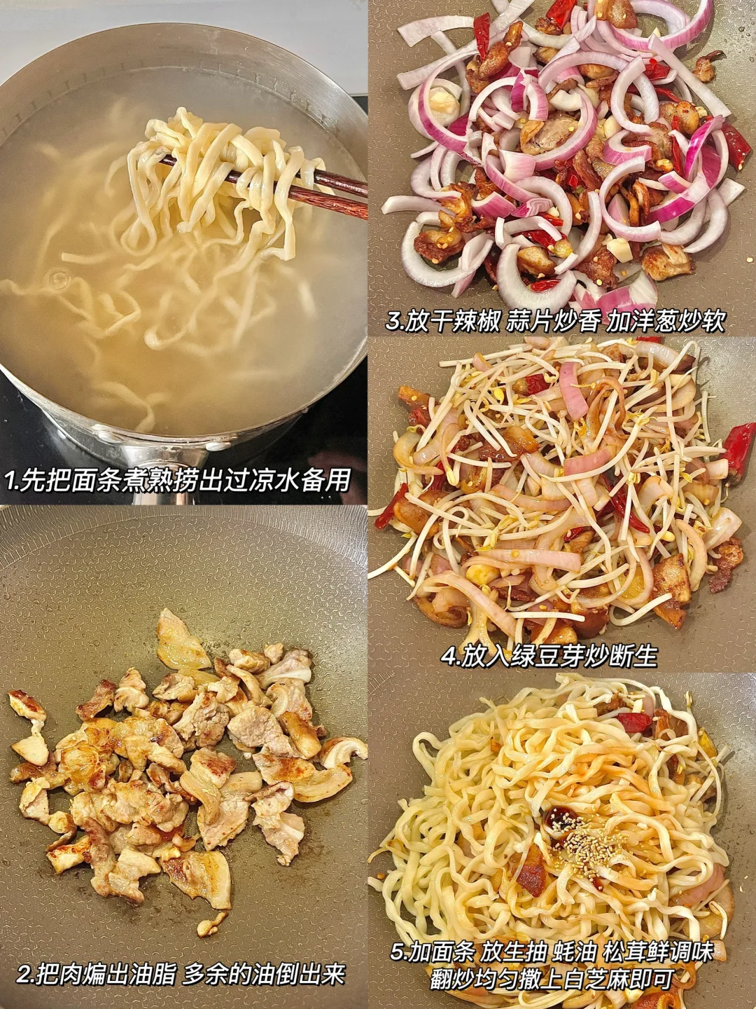 太爱我的减脂餐了,瞧、这碗简单的炒面,你就去做吧,又香又辣,吃了忘不掉的那种,面食脑袋吃一次就会爱上的面呀! 食材🥬:洋葱🧅 干辣椒 面条 蒜🧄 肉🥩 绿豆芽 做法在图上⬆️ 简单好吃 快去试试吧~