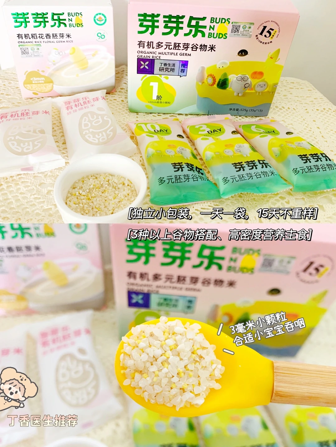 🌈做了功课后,我跟着丁香医生选择了芽芽乐家得胚芽米,粉盒的纯碎胚芽米可以入门初尝试,它的留胚率高达92% 👏,口感香甜,1阶段谷物胚芽米还切成了3mm的小颗粒,更合适刚添加辅食粥的宝宝,搭配的谷物都是软纤维的,也是低敏的谷物,宝宝更容易吞咽。15天不重样搭配,独立小包装,超方便。