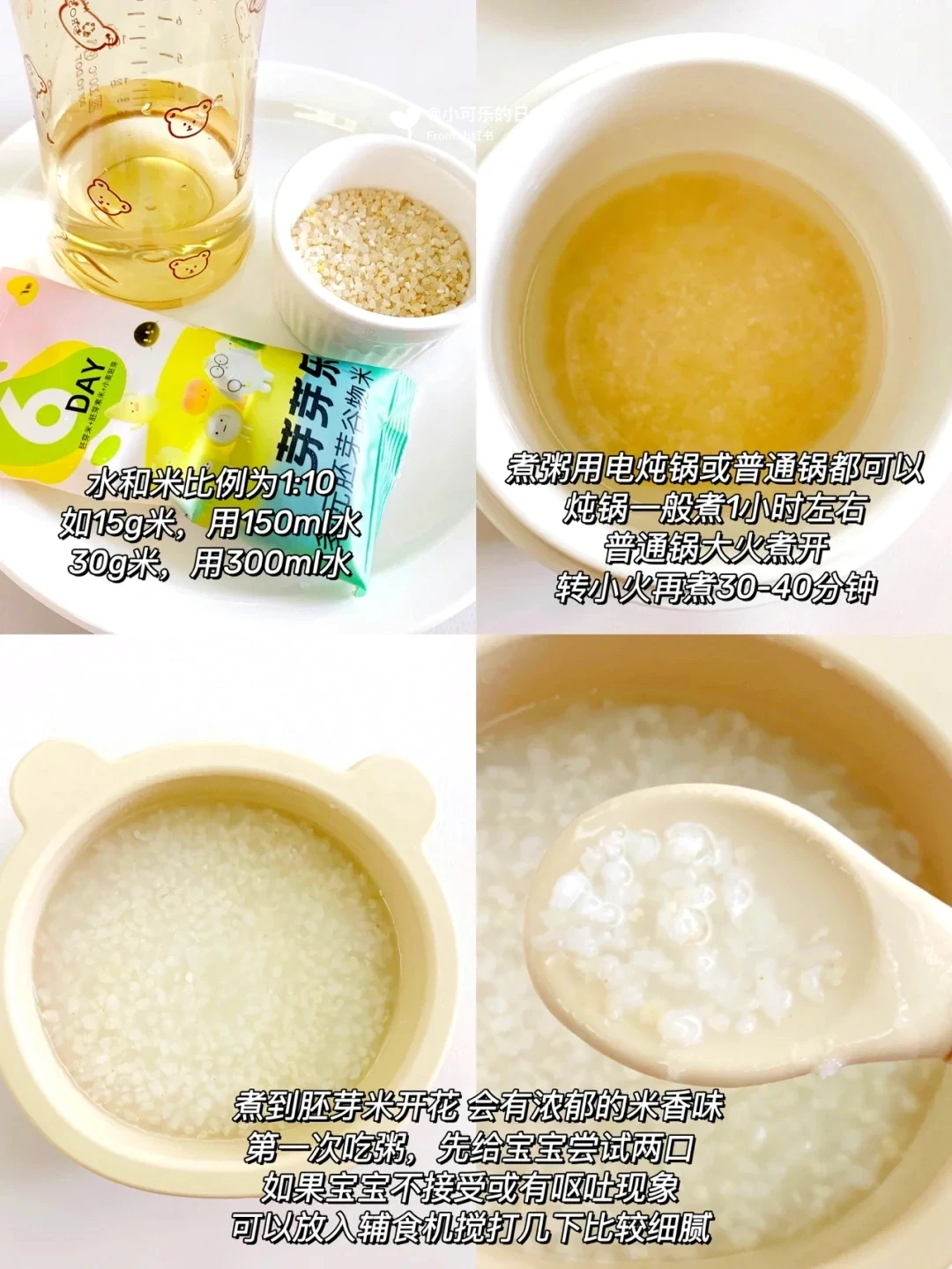 从10倍粥开始,米和水比例为1:10,例如20克米,200毫升水,如果米30克,水就是300毫升,以此类推,再慢慢过渡到8倍、7倍…