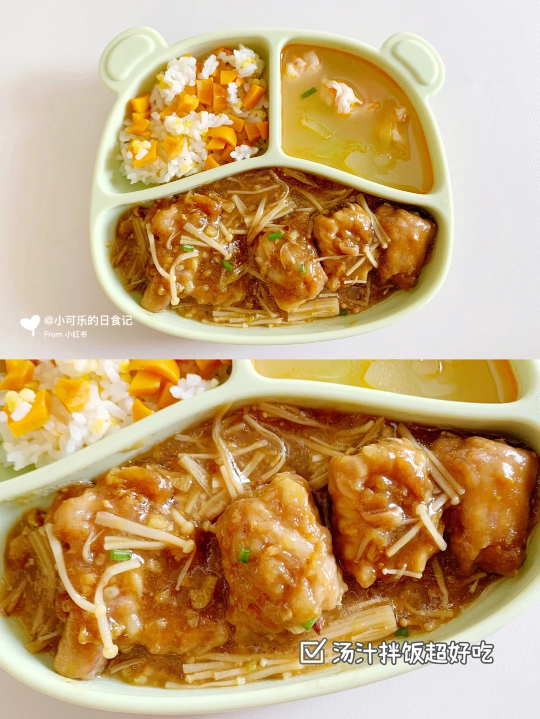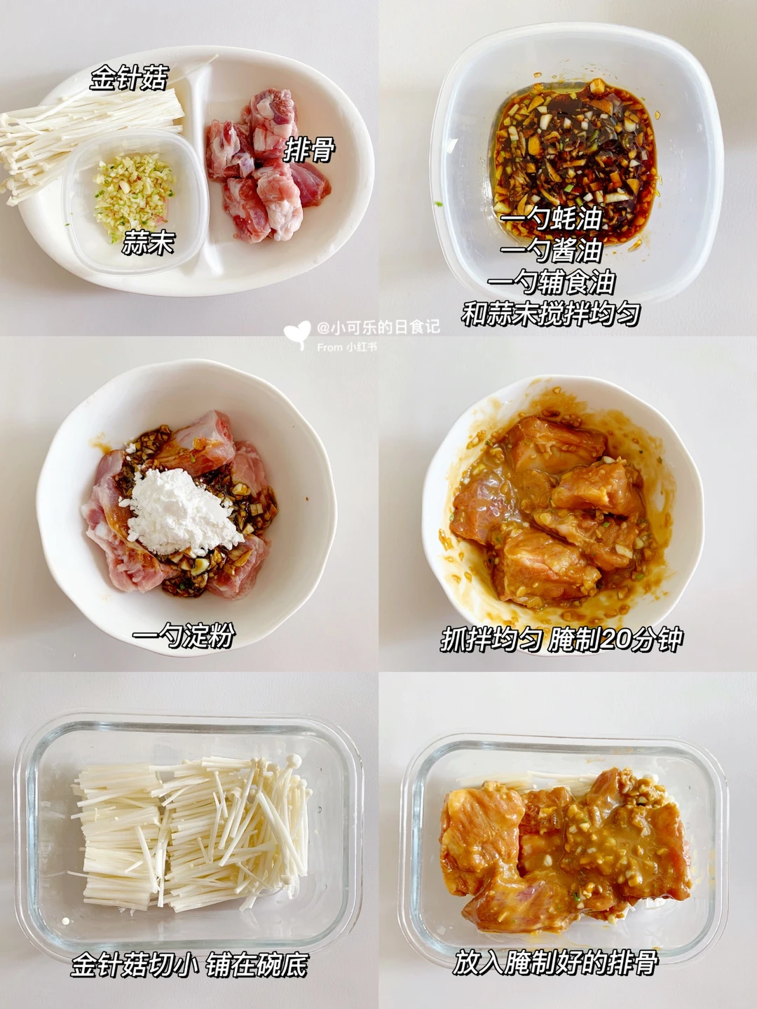 ②酱汁倒入排骨里,放一勺淀粉,抓拌均匀,腌制20分钟,蒸碗里平铺金针菇,再放入腌制好的排骨