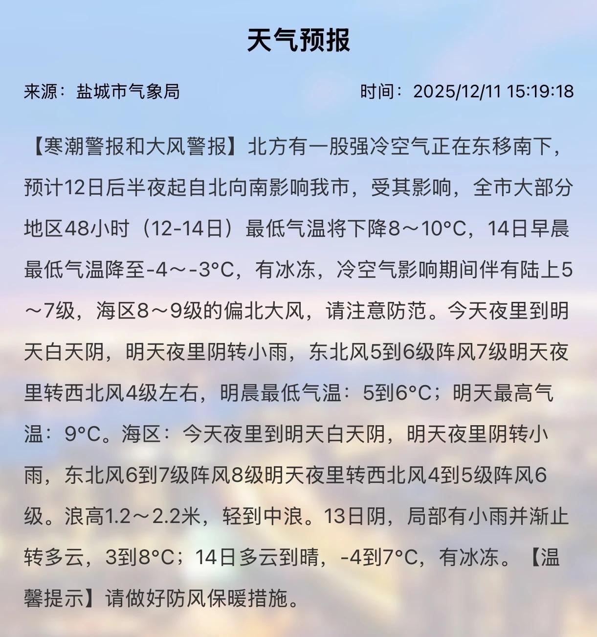 江苏盐城:刚刚,寒潮预警!马上抵达盐城 盐城市气象台2025年12月11日17时32分发布寒潮蓝色预警信号受强冷空气影响预计12-14日我市响水、滨海、阜宁、建湖、射阳、亭湖、盐城经开区、盐都、盐南高新区、大丰、东台的大部分镇(街道)48小时最低气温将下降8~10℃14日早晨最低气温降至-4~-3℃有冰冻冷空气影响期间将伴有陆上5~7级海区8~9级的偏北大风市应急、气象联合提醒做好防范 寒潮来袭最低气温将下滑到0℃线以下最高气温同样会出现明显的下滑一定要注意保暖哦 寒潮预警发布后要注意啥?一起来看↓ 小布再次提醒大家出门记得添衣谨防感冒。