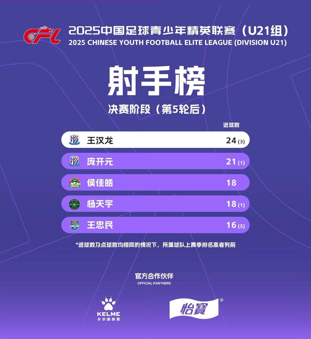 2025中国足球青少年精英联赛(U21组)决赛阶段积分榜射手榜(第5轮后)