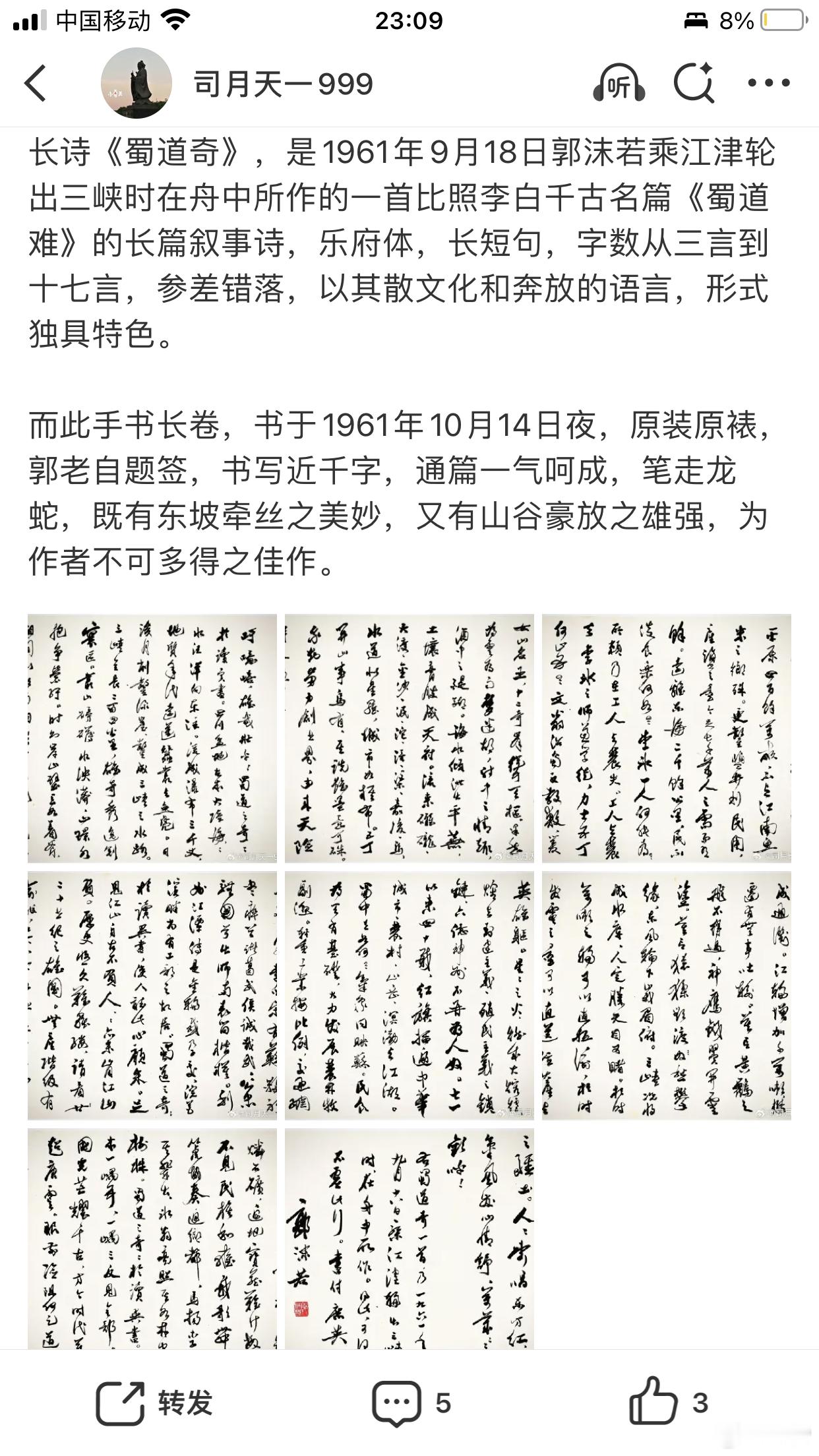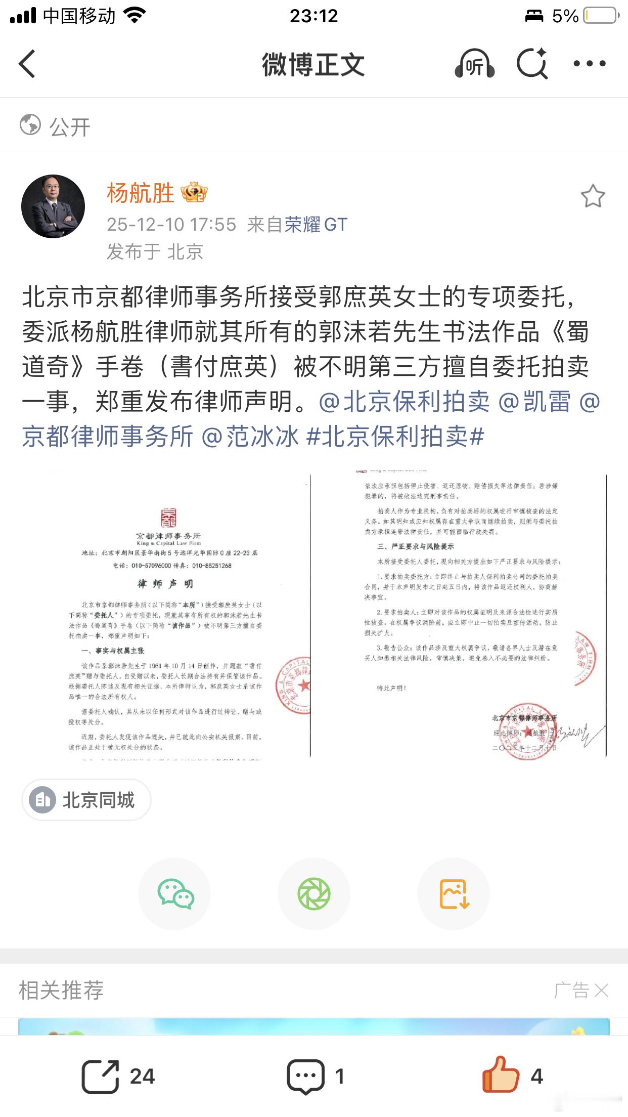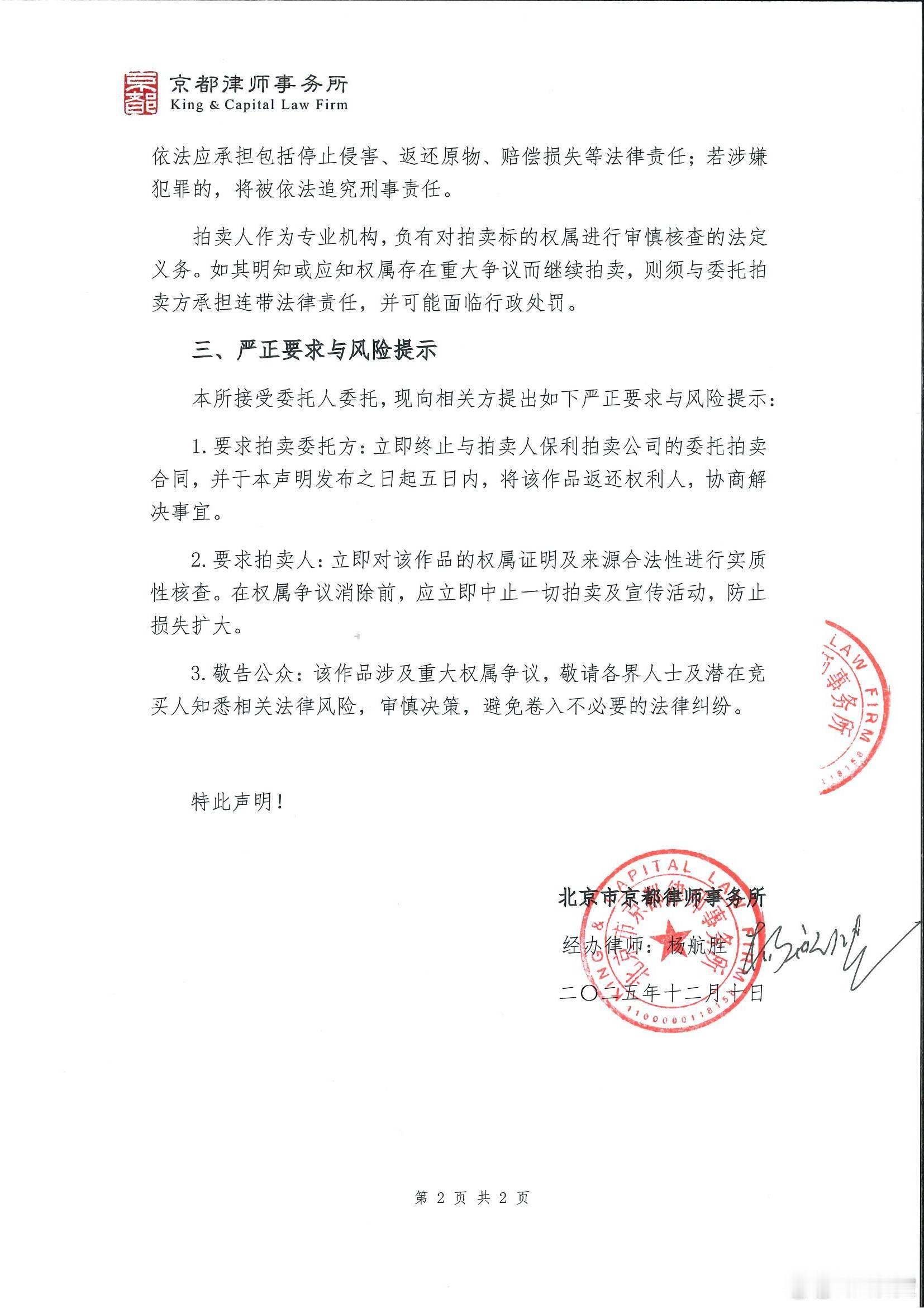 《郭沫若竟遭遇侵权,保利秋拍遭正主追诉》原来侵权了,保利拍卖实不应该!保利秋拍巡展估价800万的上品郭沫若1961年手书《蜀道奇》,正在巡展中,即将于下周开拍,万万没有想到,原来是侵权的拍品,正主已经严正声明追究!这是什么意思,原来藏品的正主是郭沫若女儿郭庶英,好么,藏品有正主,居然以来路不明的方式要出手,这是洗赃还是要干什么! 刚刚刷到著名律师杨航胜的社交媒体,他是郭家的代理律师,刚刚发出律师信!在近代代书坛,郭沫若小字行草足可以占有一席之地,比之闻名于世的大字更为难得。而近千字《蜀道奇》在学界、评论界更是作为他小字行草的最高水平被奉为圭臬。郭沫若自作诗手迹多保存于纪念馆、博物馆等国家机构。 如此文采斐然、传承有序、着述累累、原装原裱的郭沫若自作诗小行草长手卷在拍卖市场没有先例,上了保利秋拍,海内外瞩目。还以为是郭沫若女儿没有付诸博物馆,而是交付市场,结果,好么,原来保利侵权了,这对得起郭沫若和自己的品牌吗? 《蜀道奇》从何而来,这是1961年9月18日郭沫若乘江津轮出三峡时在舟中所作的一首比照李白千古名篇《蜀道难》的长篇叙事诗,乐府体,长短句,字数从三言到十七言,参差错落,以其散文化和奔放的语言,形式独具特色。而此手书长卷,书于1961年10月14日夜,原装原裱,郭老自题签,书写近千字,通篇一气呵成,笔走龙蛇,既有东坡牵丝之美妙,又有山谷豪放之雄强,为作者不可多得之佳作。书赠与爱女郭庶英。 好么,原来郭庶英原来根本就不知道,这是典型的盗取,正主委托律师,不止是抗议,这是维权!追诉保利,要求撤拍,保利当尊重知识产权,更当向正主交待来源,当然,毕竟不比国际拍卖行之严谨,估计郭沫若女儿会进一步诉诸法律!且看。