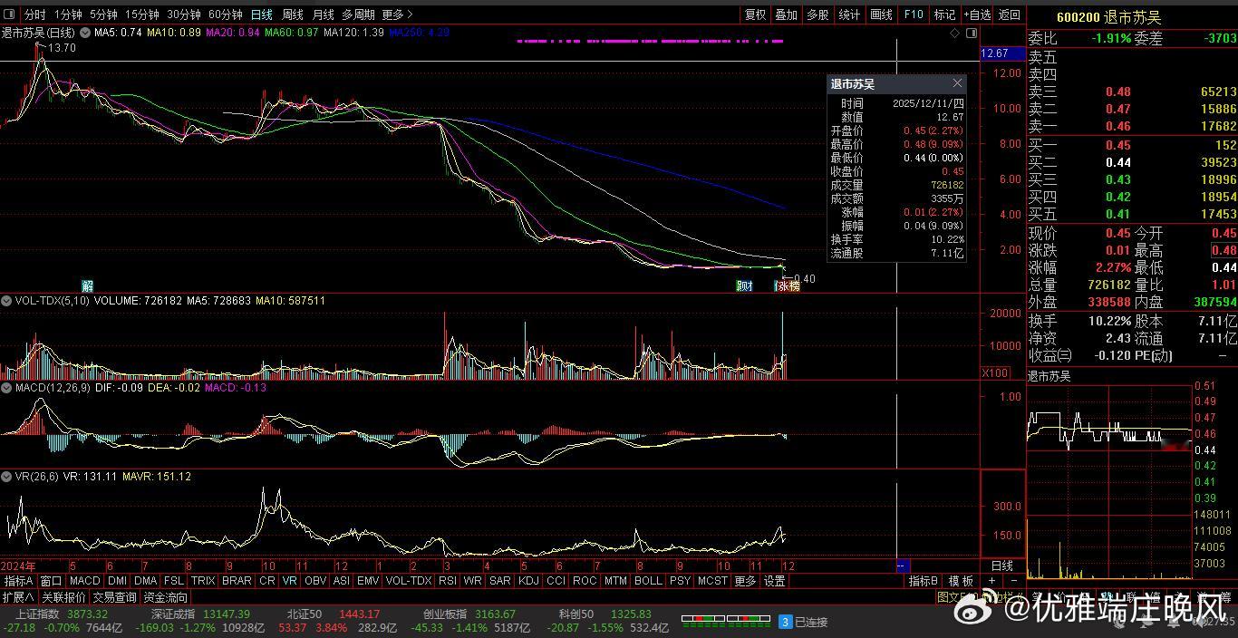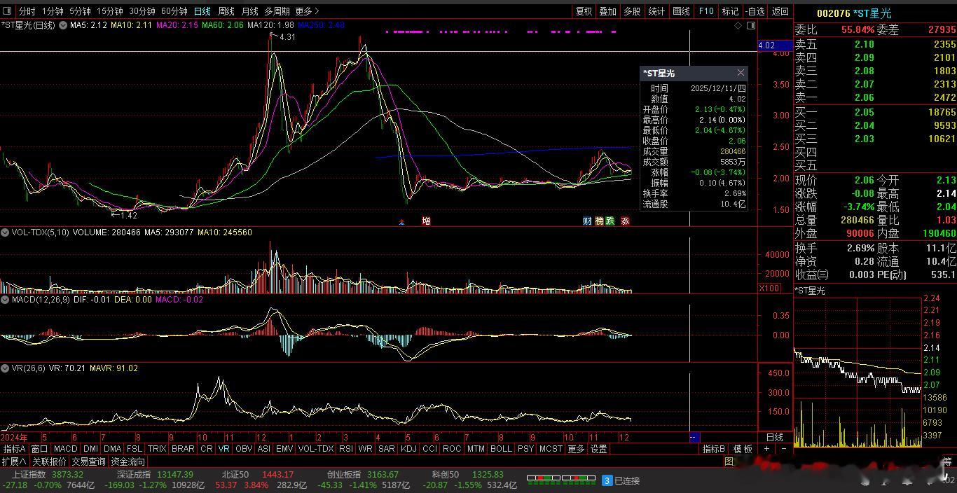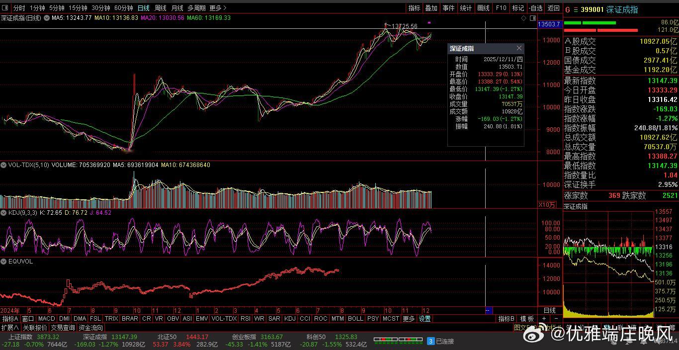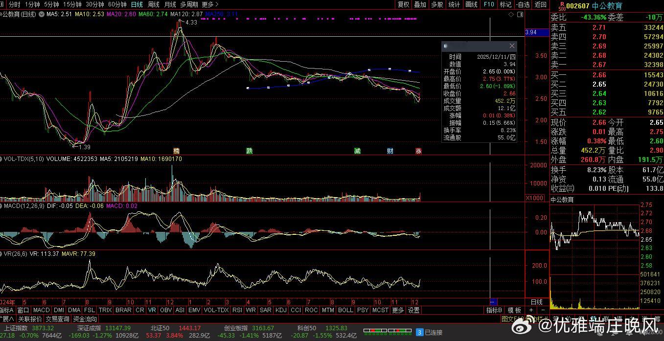【财富晚茶】三元股市收评:沪指跌0.70%:酿酒强势上扬渔业探底导语:作者系《网易号》优质财经领域创作者。曾经原创作者和知名网易号旅游领域创作者。大跨度行业等的写作,颇受网友喜爱。作品发表于2025.12.11.15:18优雅端庄晚风。(标题作品:法国是顶级葡萄酒的摇篮:波尔多五大名庄尤为知名:其中之一:拉菲(Chateau Lafite Rothschild)酿酒酒窖)一、*ST星光:八年箱底002076 *ST星光 盘中-01涨1、八年筑底:底部震荡今日视野:前期双顶,杀跌到位。2025-12-11 截止15:00:收盘股价:2.06元,上涨-3.74%。成交总量:280466手。成交金额:5853万元。总换手率:2.69%。总市值达:21.47亿元,流通市值:21.47元。2、汽车照明:锂电设备主营业务:LED照明-紫外消杀-汽车照明-锂电池生产设备研产和销售。公司品牌:光科技应用-锂电池头部企业。3、营收良好:净利减亏业绩盈亏:2025-09-30 三季度报:公司营收:1.6865亿 同比增36.04%,实现净利润320.2526万 同比增256.29%。二、多空搏杀:沪深绿盘1、追踪盘面:蛛丝马迹沪深场景:早盘:高开二涨,三跌二涨。午盘:三跌一涨,二跌二涨。尾盘:深指:三跌一涨,次低绿盘。看点之一:沪指弱势:股指低开:盘中震荡:瞬间下探。深创两指:跌幅超1%。看点之二:一枝独秀:北证50指:逆市走强。大幅拉升:暴涨超6%。看点之三:沪深北市:合计成交:18855亿元。场内个股:4377股飘绿。2、板块涨跌:风口依然涨跌观察:板块见证:板块上涨:酿酒等。板块走低:地产、零售、纺织服装、食品饮料等。概念活跃:次新股、可控核聚变、商业航天、特高压等。3、技术看盘:涨跌位置观K线提示:精彩多空博弈。12月12日:沪指突破阻力:03904点看涨,前程似锦;跌破支撑位:03862点看跌,日暮途穷。深指突破阻力:13388点看涨,鹏程万里;跌破支撑位:13147点看跌,不堪造就。三、三元板块:风口潜水1、追踪盘面:视角视野三元回调,沪深弱势。12股上涨,涨幅5%以上:2股涨停板。118股下跌,跌幅5%以上:23股跌停板。涨幅0%:0股0停板。涨幅0.00%+上涨个股:0+12=12股票赚钱。沪深两市:合计成交18855亿元。总体归纳:三元股票:盘口弱势。2、追踪盘面:主力进退换位思考:沪深弱势,尾盘抢筹。沪指距9:31-15:00:前1小时放量盘跌,中2小时略量盘跌,后1小时略量盘跌。深指距9:31-15:00:前1小时放量盘升,中2小时略量盘跌,后1小时略量盘跌。沪深两市:合计成交:18855亿元。四、透析个股:聚焦涨跌1、涨幅榜眼:处排查摸主旋律:涨幅榜之中:寻找启动300266 兴源环境 600200 退市苏吴 002607 中公教育涨幅榜-1:300266 兴源环境主营业务:环保装备智慧环保-环境综合治理-农业农村生态等研产和销售。公司品牌:国资实控人新希望民营大股东资源优势强强联合和头部企业。涨幅榜-2:600200 退市苏吴主营业务:退市。公司品牌:退市标的。涨幅榜-3:002607 中公教育主营业务:招录考试培训-职业资格证书-学历提升-职业技能培训等。公司品牌:国内领先的就业与再就业服务提供商。2、跌幅榜眼:处排查摸主旋律:跌幅榜之中:寻找金子600467 好当家 601828 美凯龙 300344 *ST立方跌幅榜-1:600467 好当家主营业务:海产-冷冻食品等研产和销售。公司品牌:名优特水产生态化养殖头部企业。跌幅榜-2:601828 美凯龙主营业务:家居装饰-家具商场经营等研产和销售。公司品牌:国内领先家居装饰及家具商场运营商和泛家居业务平台服务商。跌幅榜-3:300344 *ST立方主营业务:智能软硬件-数字化智能-数字智能服务等研产和销售。公司品牌:新型数字基础建设的数字科技云服务商。3、潜力榜眼:处排查摸主旋律:潜力榜之中:寻找估值002496 *ST辉丰 300301 *ST长方 000669 ST金鸿潜力榜-1:002496 *ST辉丰主营业务:生物农资-农资电商-石化仓储供应链-项目投资。公司品牌:中国领先亚临界小分子高温裂解工艺高科技专利产品和头部企业。潜力榜-2:300301 *ST长方主营业务:LED照明光源器件。公司品牌:LED照明光源器件头部企业。潜力榜-3:000669 ST金鸿主营业务:天然气。公司品牌:国内最具实力的综合性清洁能源服务商。五、本创作者:优质网易投资投机迷茫之中:给予尽可能有帮助:资本市场风险自负。(优雅端庄晚风《网易号》优质财经领域创作者和原创作者; 违者必究)
