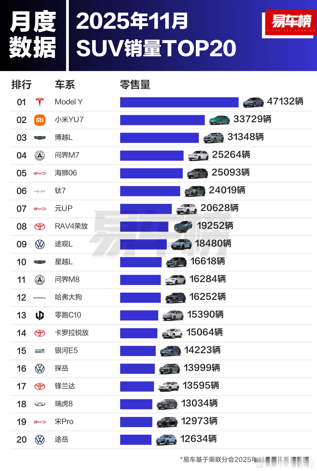 2025年11月分级别车型销量TOP20根据易车整理的乘联分会零售数据显示:MPV销量前3名分别为:魏牌高山、岚图梦想家、赛那;零售销量分别为:10416辆、9027辆、6701辆。SUV销量前3名分别为:Model Y、小米YU7、博越L;零售销量分别为:47132辆、33729辆、31348辆。轿车销量前3名分别为:宏光MINIEV、星愿、轩逸;零售销量分别为:56756辆、42038辆、38434辆。汽场全开易车榜魏牌高山特斯拉modely宏光miniev