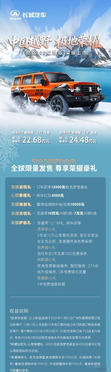 坦克300极地版荣耀上市,22.68万元起!候补渠道已开启,限量机会等你锁定。