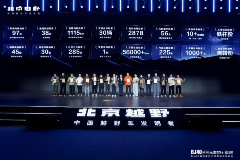 北汽集团董事长张建勇为BJ40增程“车主之最”用户颁奖。16位获奖用户包括等车时间最久用户、行驶里程最长用户、一箱油单次跑出最远里程用户等,他们用一个个动人的故事,让BJ40增程不仅仅是一台车,更成为一种文化,一种精神符号。