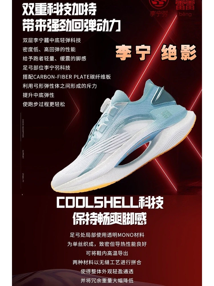特点:李宁在绝影上配置了Z强科技,coolshell鞋面非常透气。中底镂空设计,双层beng,双层碳板,jiang科技,缓震和回弹很好[点赞R]