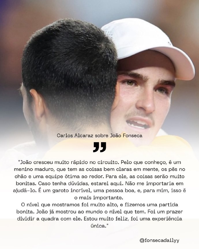“若昂在赛场上进步神速。我知道他是个成熟稳重的孩子,头脑清晰,脚踏实地,而且身边还有一支很棒的团队。对他来说,未来一定不可限量。如果他有任何疑问,我都会来到他身边,我很乐意帮助他。他是个非常棒的孩子,人品也很好,对我来说这才是最重要的。