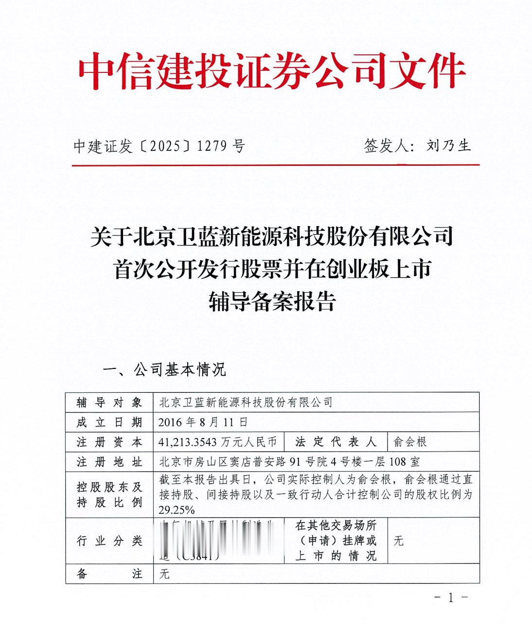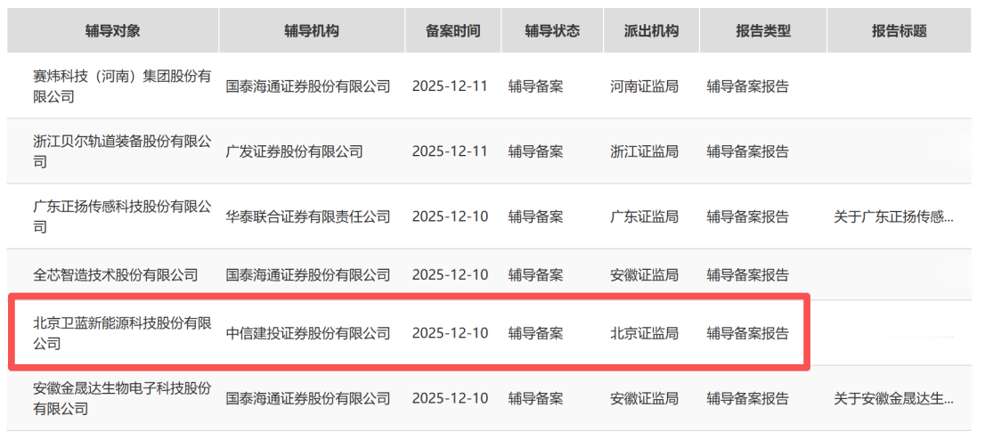 上证报中国证券网讯(记者王玉晴)中国证监会官网显示,12月10日,北京卫蓝新能源科技股份有限公司(简称“卫蓝新能源”)向北京证监局提交创业板IPO辅导备案,辅导券商为中信建投。