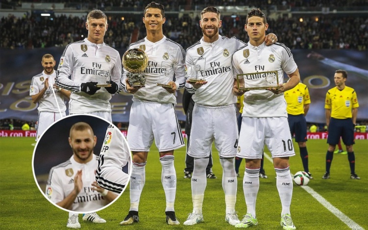2014的皇马获得了欧冠冠军,队内球员克罗斯、C罗、拉莫斯均入选了次年国际足联评选的最佳阵容,C罗更是荣获金球奖,J罗则是获得了14年的普斯卡什奖。四位球员在一场比赛的赛前展示了所获奖杯。未来的金球先生本泽马站在他们身后看着他们,微笑着鼓掌。