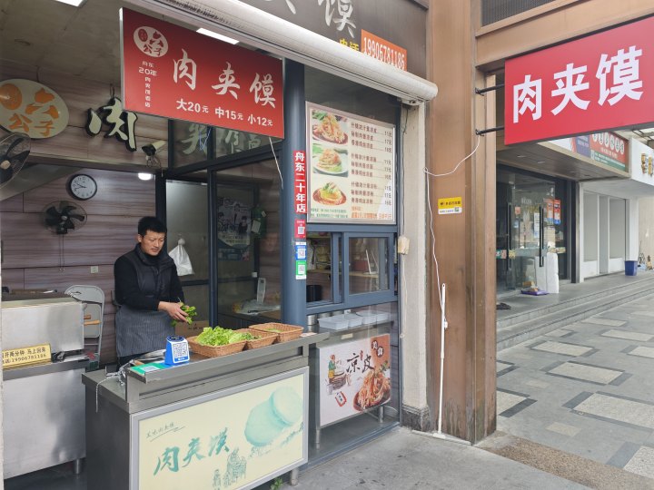 如今的舟山东路焕然一新,只是不复当年的辰光。舟东美食城仍有保留和缩影,十多家小店,“六公子”肉夹馍店就是留守的店之一。