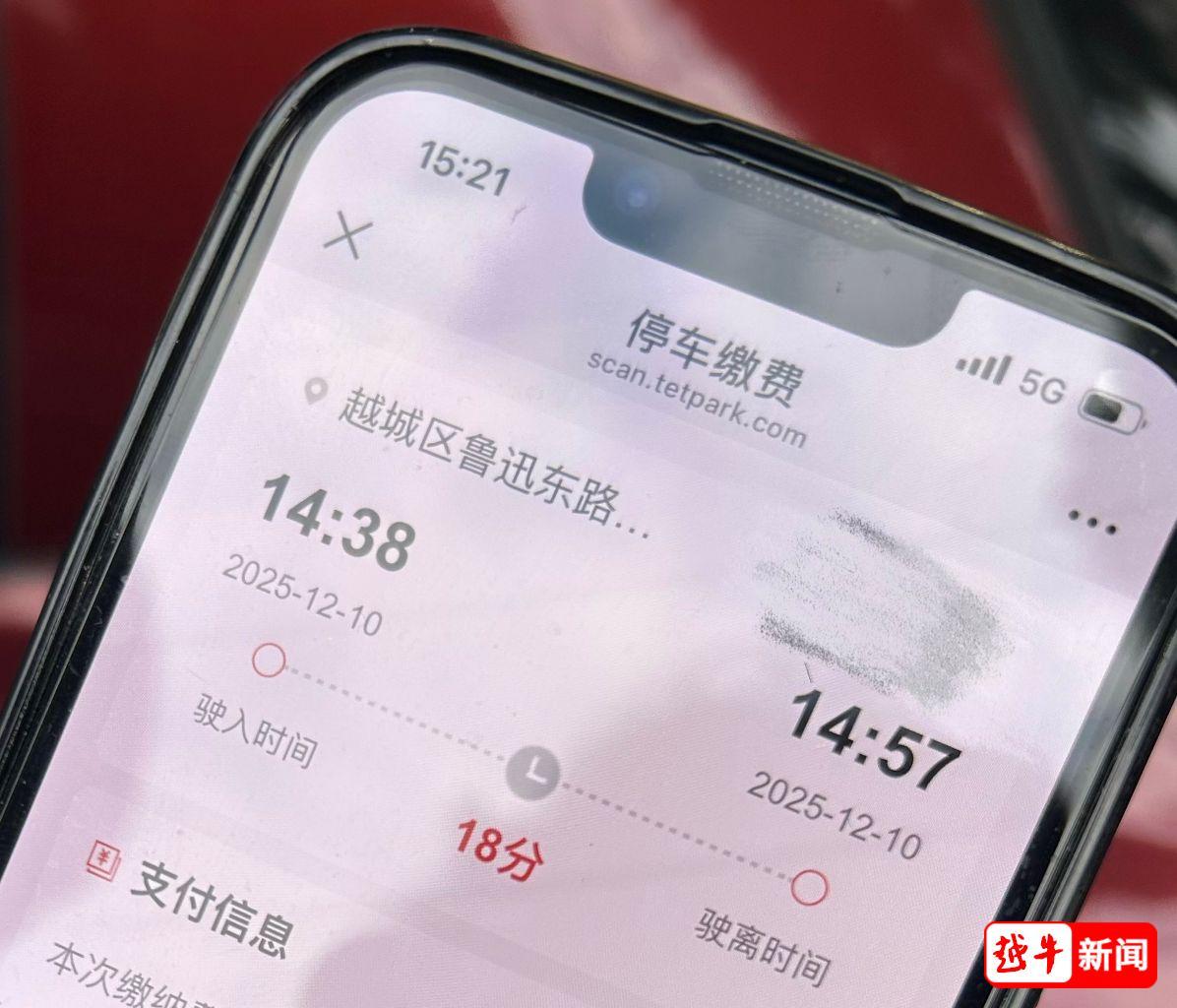 测试车辆于14时38分驶入车位开始计费,至15时20分驶离,总停车时长为42分钟,按照收费标准应缴纳2元停车费。而当车主扫码付款时发现,自己的车辆已在14时57分“驶离”,无需缴纳任何费用。