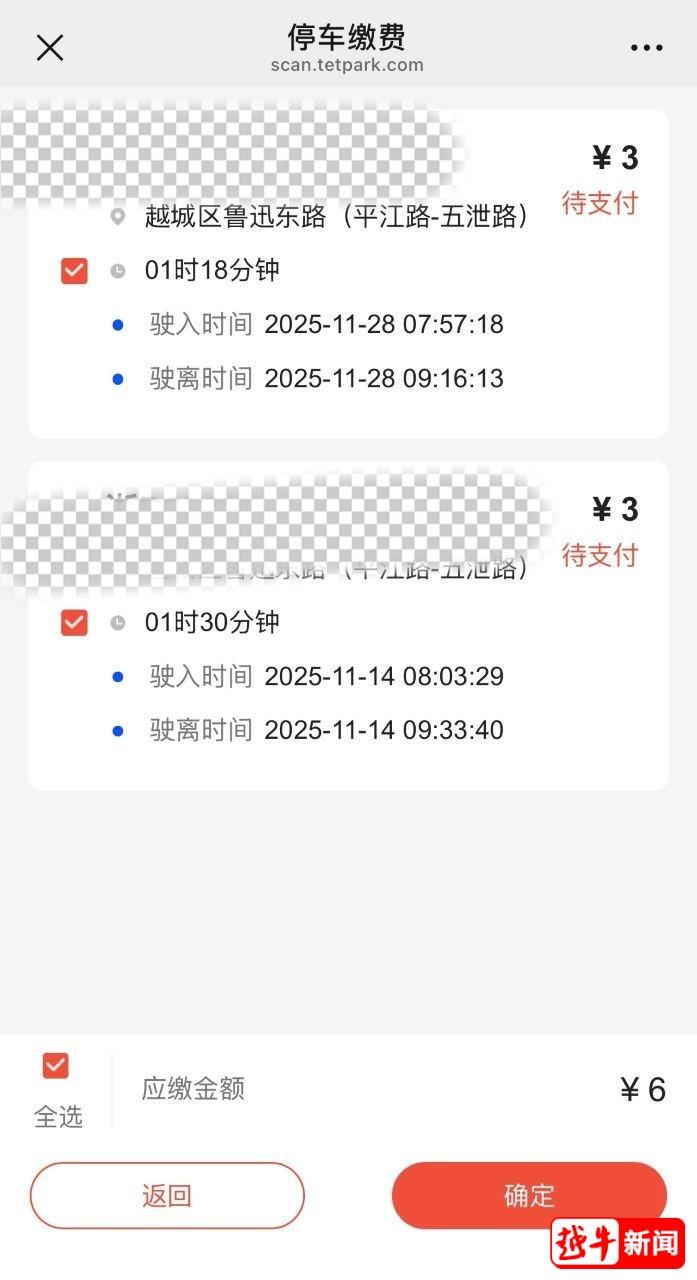 然而,12月9日,当他扫码进入“绍兴停车服务中心”小程序查询停车费用记录时,却惊讶地发现两条历史欠费记录,显示11月14日、28日,管理方分别按1小时30分钟和1小时18分钟的停车时长计算收取费用。