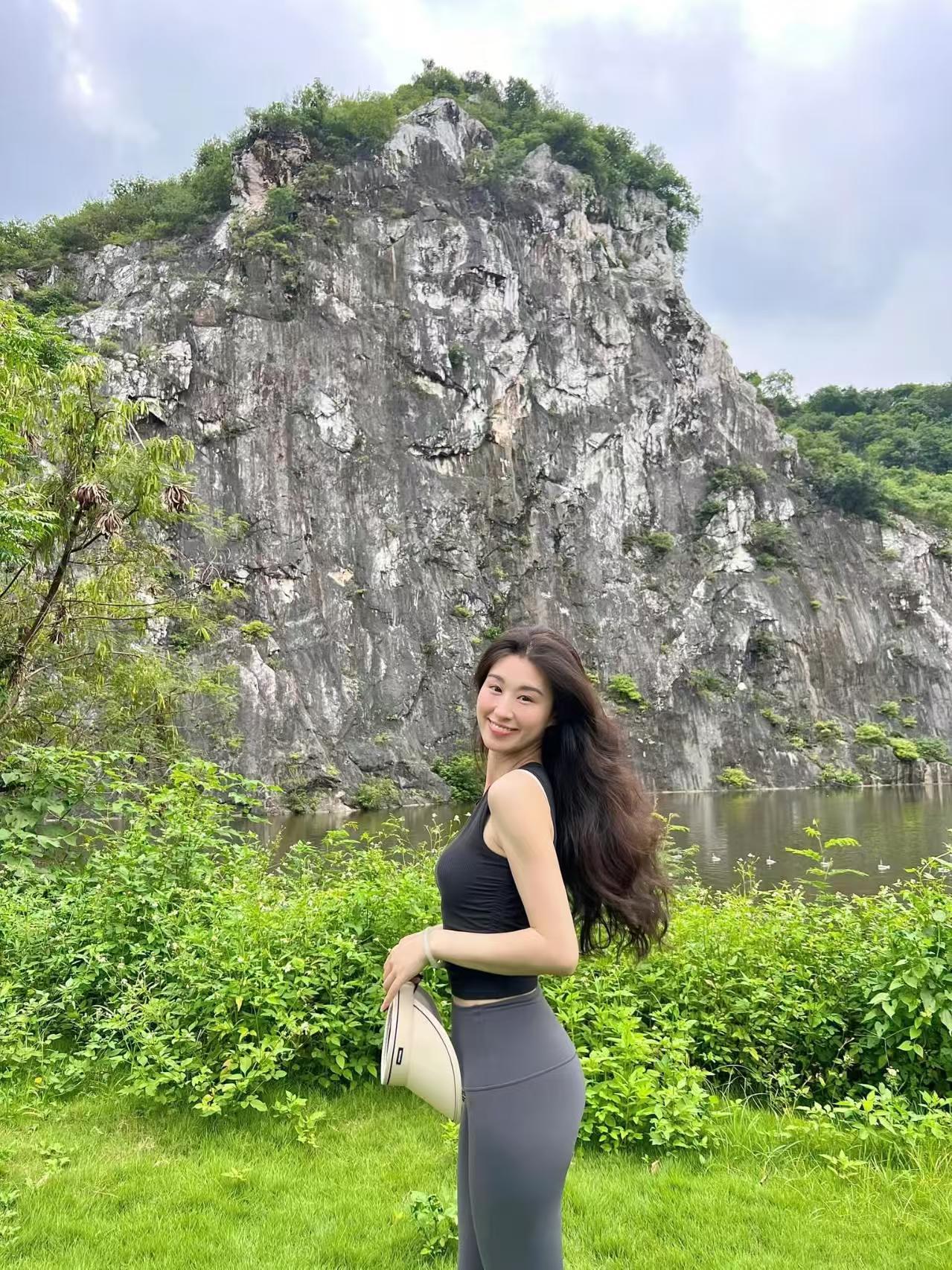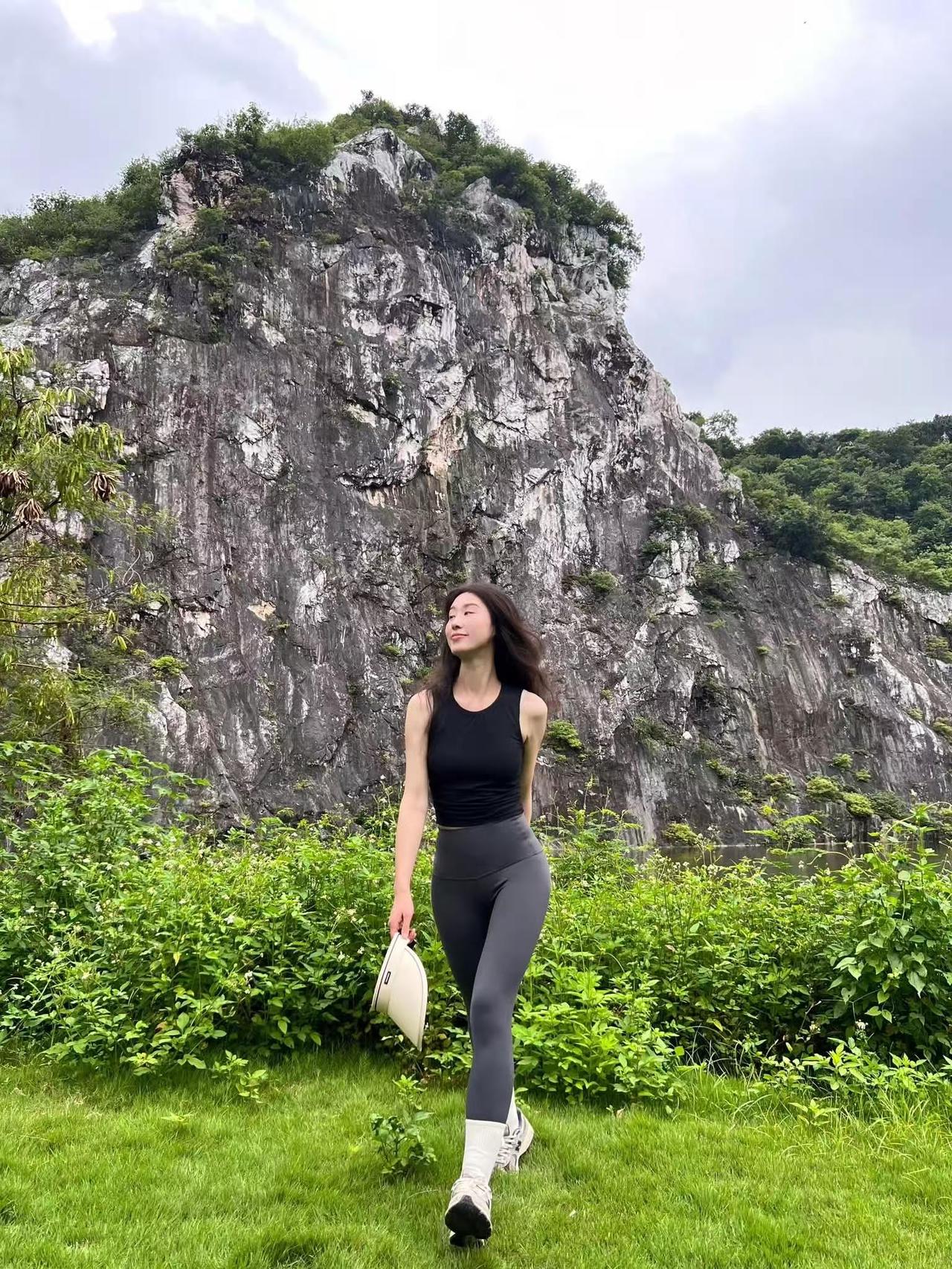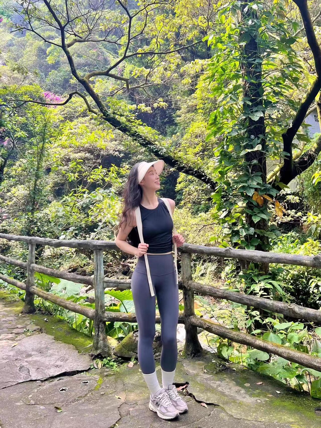 氛围感拉满:林间木栈道配着碧绿的湖水,满眼的绿意特别治愈,随手一拍都是森系大片的感觉,这环境真的太戳人了。 穿搭亮眼:黑灰瑜伽裤搭配简约背心,利落又显身材,和周围的自然景色形成反差,又甜又酷的感觉很吸睛。