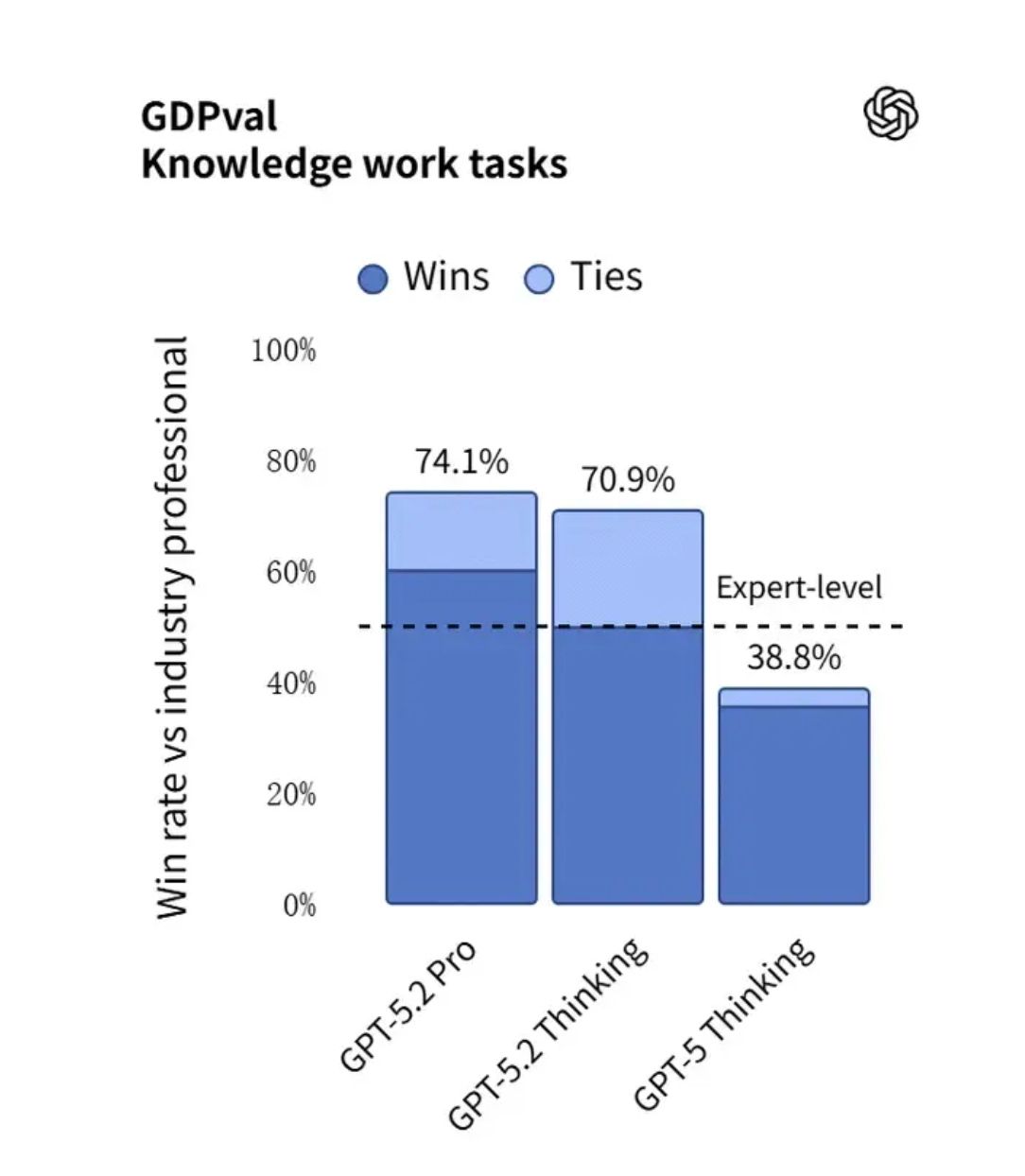 没有发布会、没有倒计时,GPT-5.2 凌晨突然上线。只有一篇技术博客和奥特曼在 X 上的轻描淡写,却挡不住背后的火药味。说白了,这是谷歌 Gemini 3 发布后,OpenAI 打出的“红色警报”版本:分成 Instant、Thinking、Pro 三个梯队,尤其是 Thinking 版,在长文理解、编程、工具调用上都明显跃升,第一次在大量专业任务里逼近甚至超越人类专家。更夸张的是速度与效率:GPT-5.2 Thinking 在 44 类知识工作里整体追平甚至超越人类专家,产出速度快 11 倍、成本低到 1%。在投行建模里,评分从 59.1% 升到 68.4%;长文本检索中,它是目前唯一能在 256k token 文档里接近满分命中率的模型。工程能力也被拉满:在跨语言、真实代码修复的 SWE-Bench Pro 上,它拿到 55.6%,刷新行业最高记录;图表推理、仪表盘和 UI 理解错误率几乎砍半。面对竞争者的贴身肉搏,GPT-5.2 更像是 OpenAI 必须打出的加速器。至于这场“红色警报”能否重新拉开ChatGPT 和别家的差距,相信很快就会见分晓。