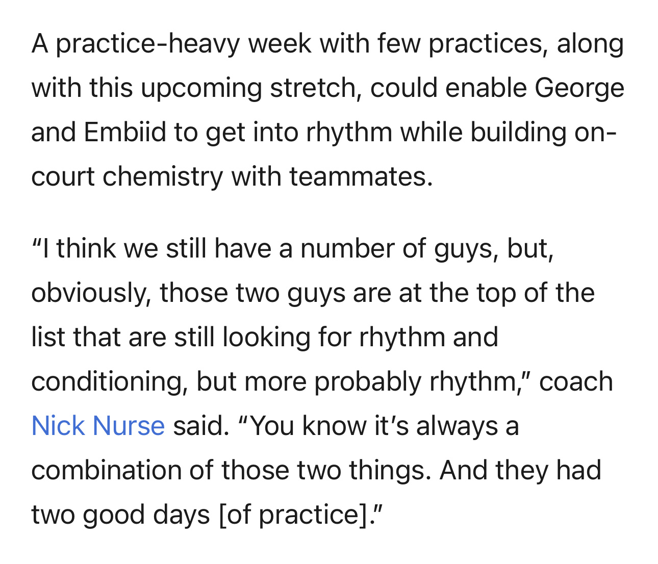 费城76人队以13胜10负的战绩,即将于本周六在主场迎战印第安纳步行者队。截至周五赛前,他们在东部联盟排名第六,距离第三名仅相差1.5个胜场。乔治对此说道:“你看看东部,局势还很胶着。目前还没有哪支球队真正脱颖而出,所以我们确实有机会从现在开始书写自己的未来。”“虽然不想给球队增加压力,但我们确实可以借此利用当前的排名形势。如果我们想在赛季中取得进展,那么每场比赛无疑都要当作重要战役来对待。”这是一周训练量较大但实际训练次数不多的特殊时期,而接下来的赛程安排或许能让乔治和恩比德在恢复比赛节奏的同时,与队友们逐步建立场上默契。主帅尼克·纳斯坦言,“虽然我们队里还有不少球员在找状态,但显然这两位是最需要调整节奏和体能的——尤其是比赛节奏,大家都知道这两者总是相互关联的。值得高兴的是,他们已经完成了两天高质量的训练。”费城76人新赛季篮不住PaulGeorge保罗乔治