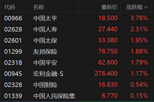 港股内险股集体上涨,其中,中国太平涨近4%,中国人寿涨2.3%,中国平安、中国太保、友邦保险涨近2%,中国财险、中国人保跟涨。
