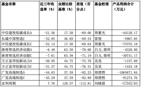 排名后10位的分别是:中信建投低碳成长A、长城中国智造C、中信建投低碳成长C、浙商智能选经济动能A、浙商智选经济动能C、方正富邦创新动力A、方正富邦创新动力C、广发高端制造A、广发高端制造C、宏利周期。它们分别跑输业绩比较基准69.06个、69.53个、69.64个、70.06个、71.19个、75.7个、76.31个、82.23个、82.89个、112.81个百分点。