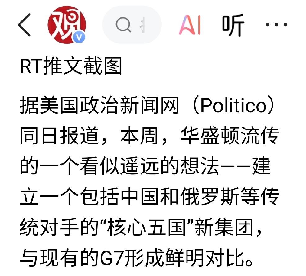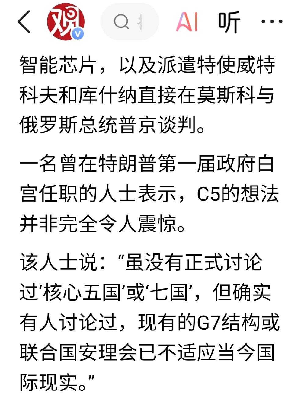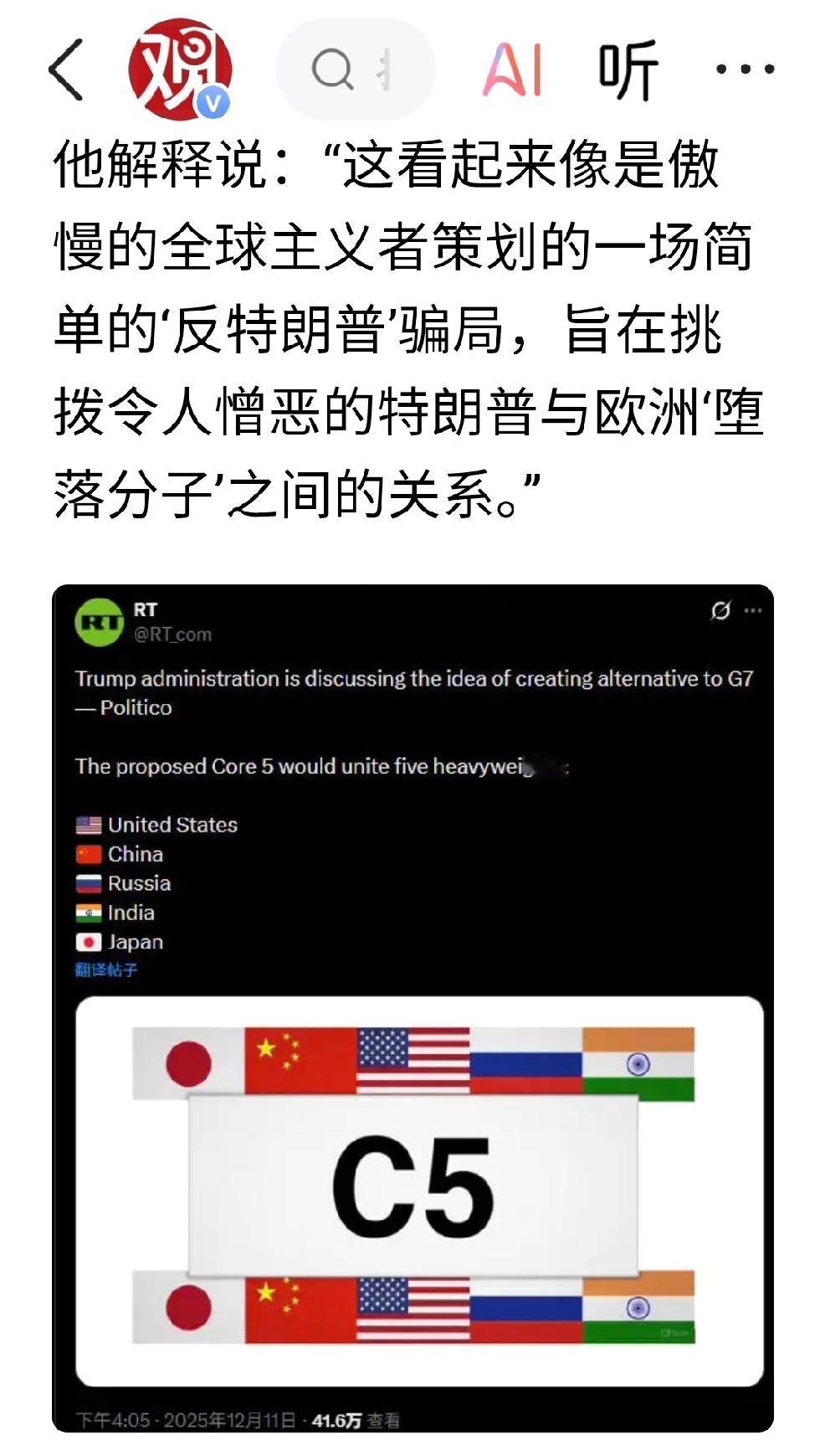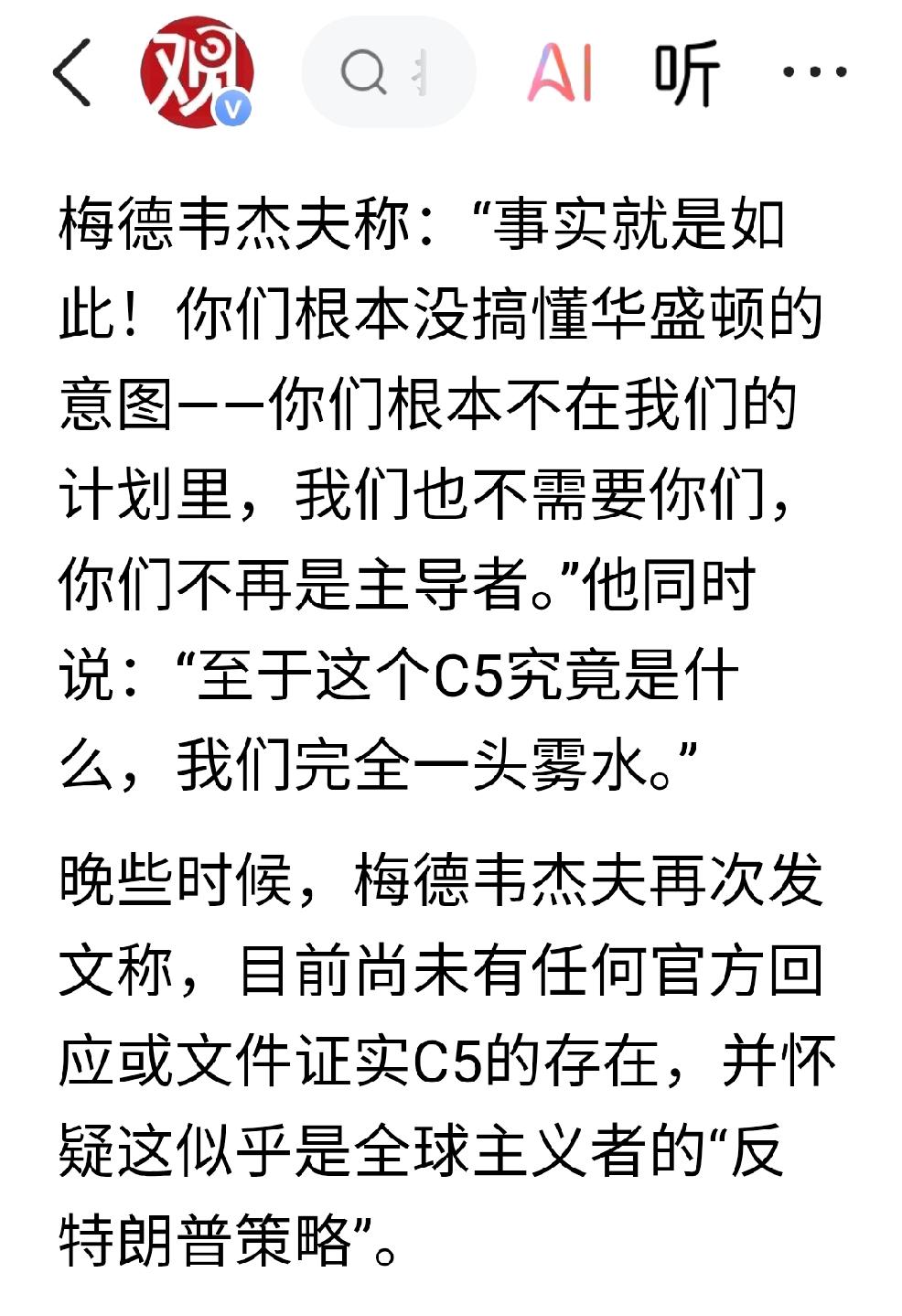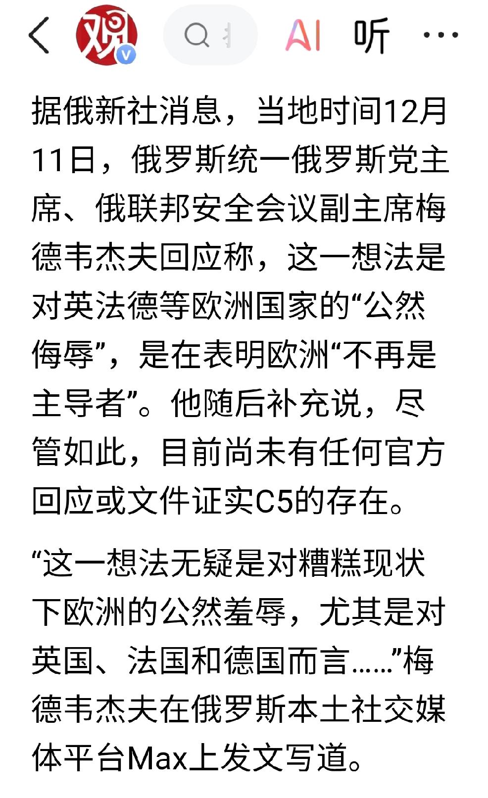 梅德韦杰夫评C5 个人观点:C5的说法,非常具有特朗普特色,中俄政府皆是沉默不语,做壁上观的同时,把这个话题交给欧盟和美国讨论,先让这个话题在空中飞行一段时间,这就是美国总统特朗普在试探外界,预热阶段。 想想今年发生的各种各样的特朗普预想计划:把加拿大吞并变为美国的一个州,把格陵兰岛吞并等等,这些隐藏美国祸心的计划,无不都是同一个模式,先行试探预热,而后正式推出,如能诈骗得手就得到了大实惠,不被蒙骗也没有损失,结果是不了了之。 所以看看世界舆论如何,看看欧洲各国的反应,不着急,等等看。