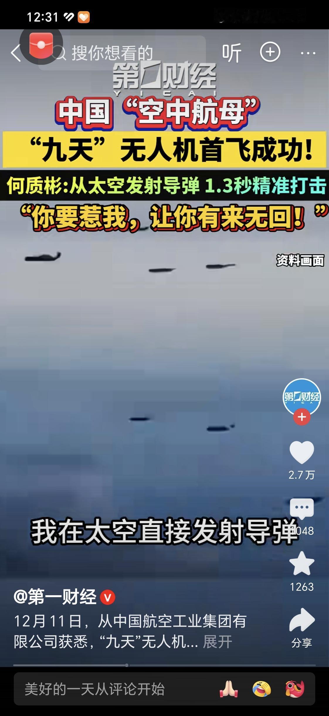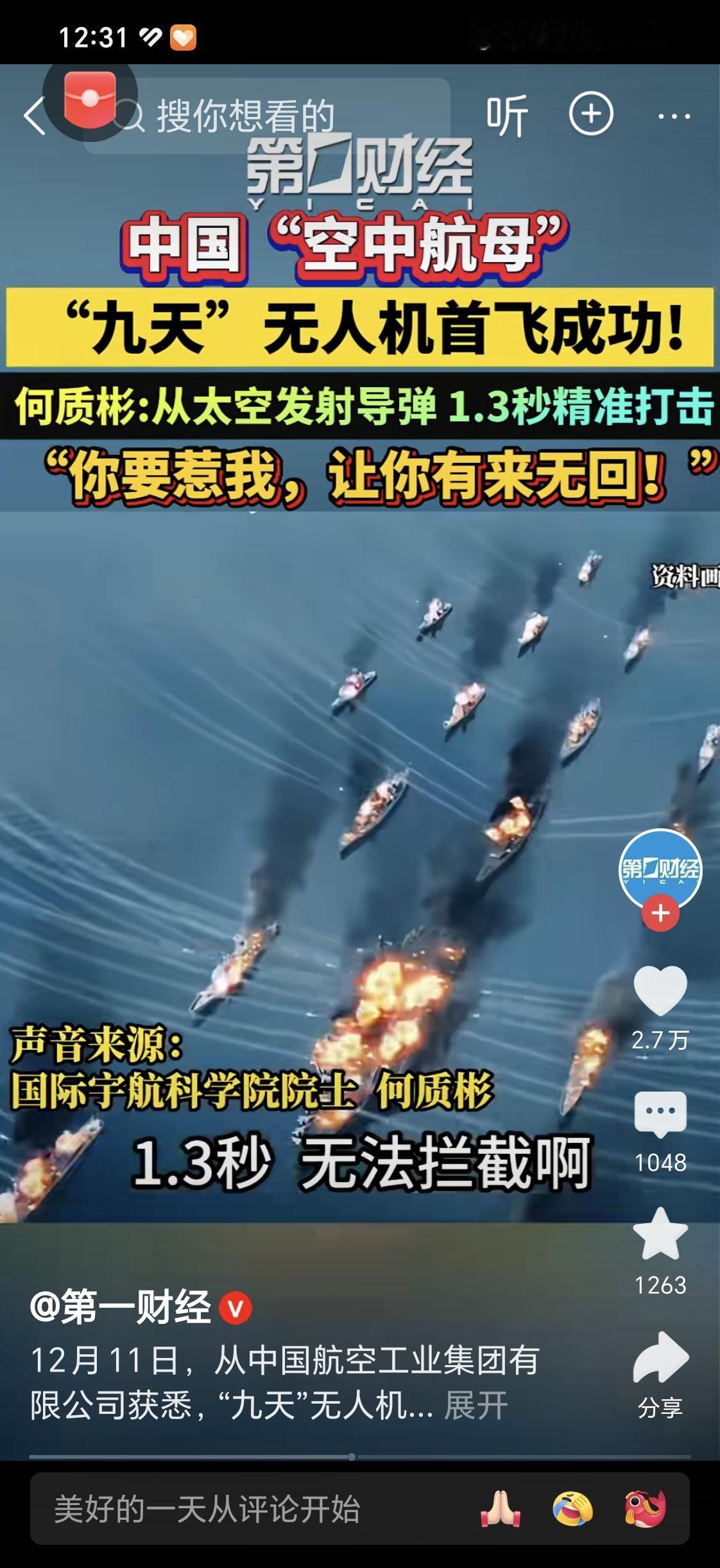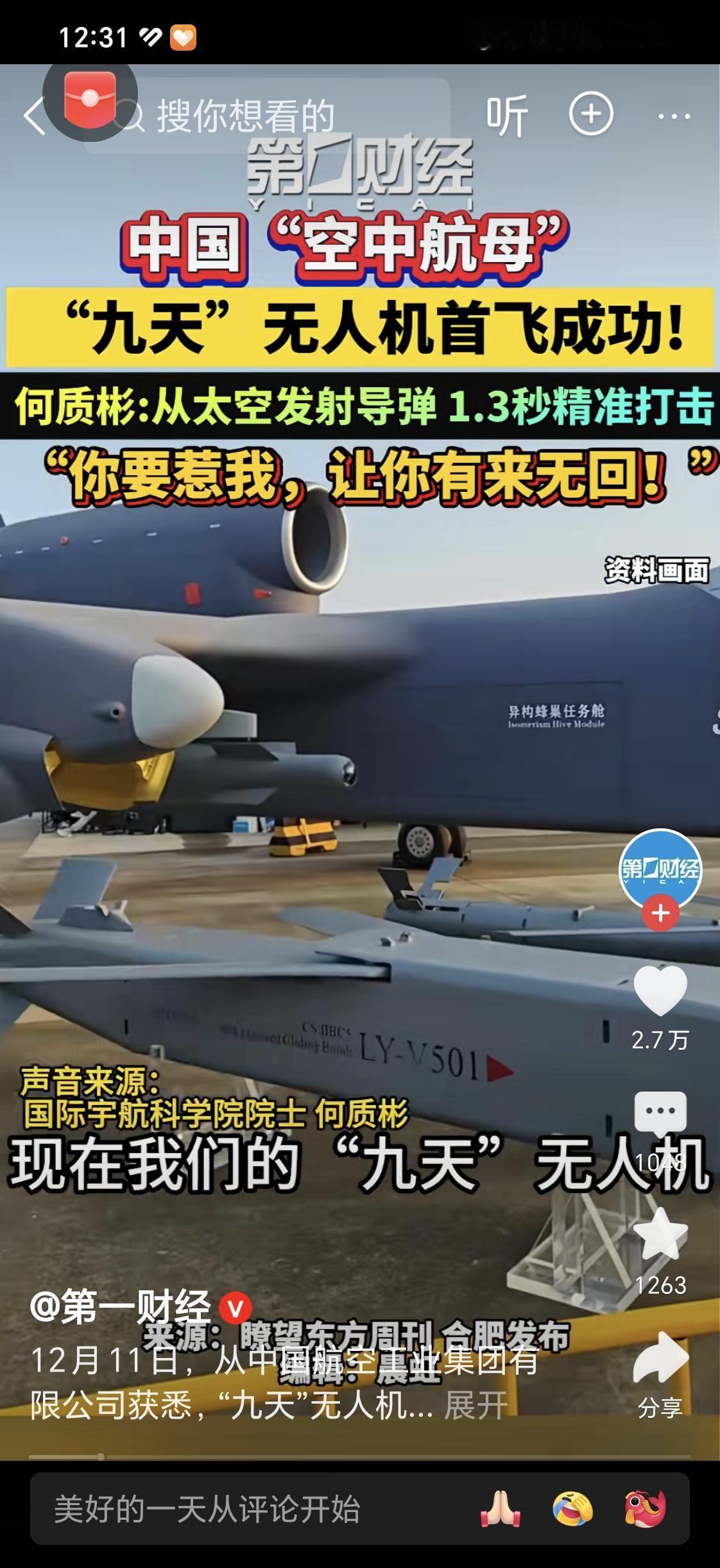 我国际宇航学院院士何质彬说:“我们的空中航母九天无人机面试,十几吨在空中运行,太空发射导弹1.3秒,速度非常快,没有办法反应,你不惹我我放你一马,你如果惹我我让你有来无回”。真给力,感谢老爷子给我们的无人机航母做出的卓越贡献。这或许也是敢于对抗美欧霸权的真正利器!一句“有来无回”就是我们的底气![赞]