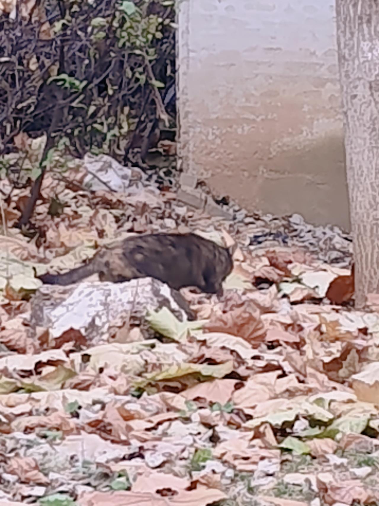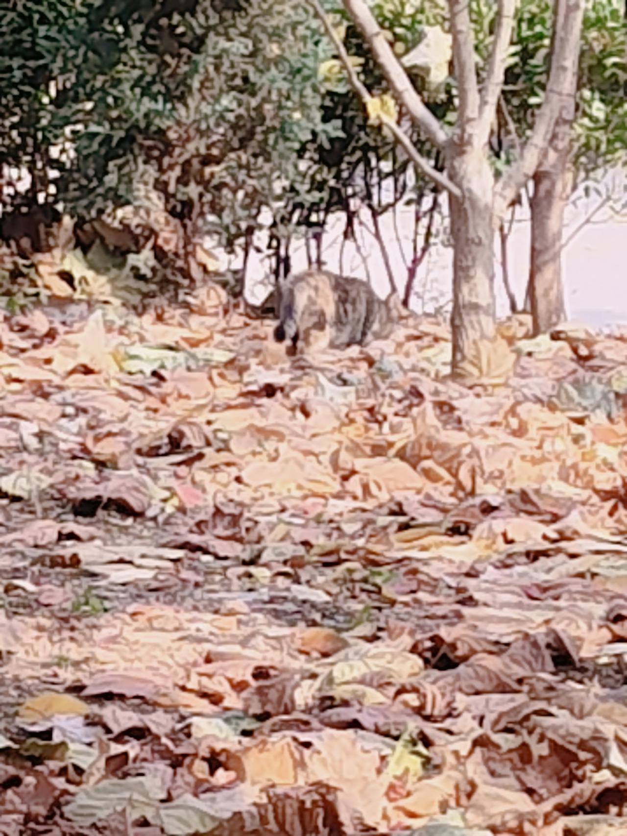 小区的老猫,在小区树林里梧桐树叶堆积的厚垫子上,一会儿翻滚,一会儿捕捉,像一个顽