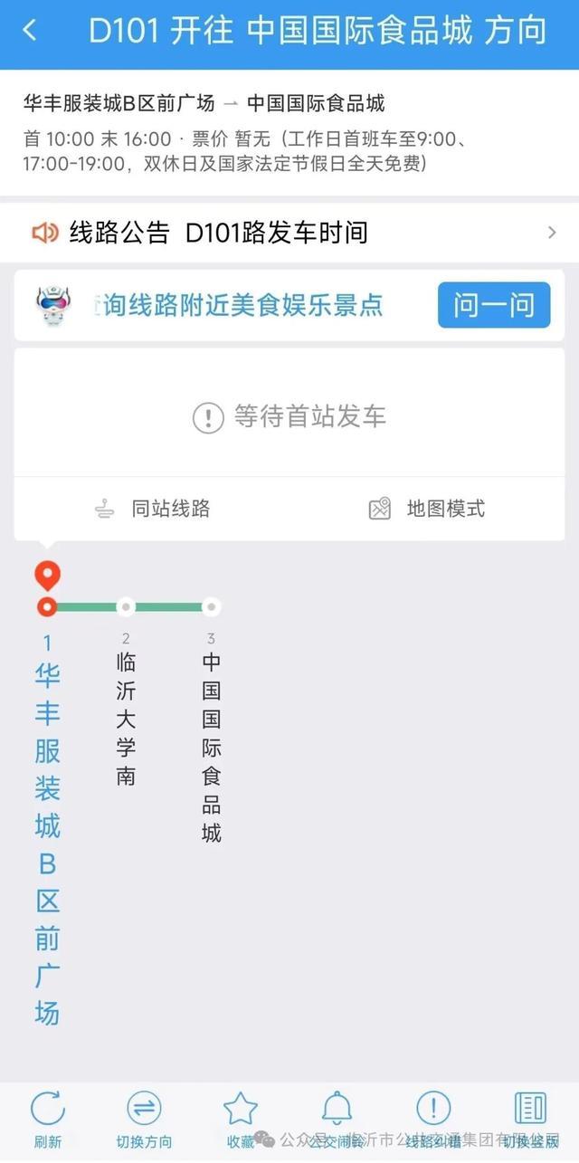查询攻略:拨打公交服务热线8313159,或打开临沂公交APP,搜索线路编号D101,发车时间、站点详情一键get