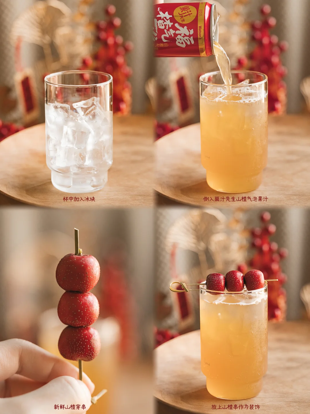 ❶杯中加入菓汁先生山楂气泡果汁和冰块