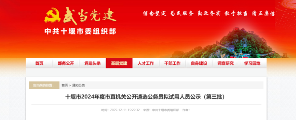 12月11日,十堰市委组织部发布《2024年度市直机关公开遴选公务员拟试用人员公示(第三批)》↓↓↓
