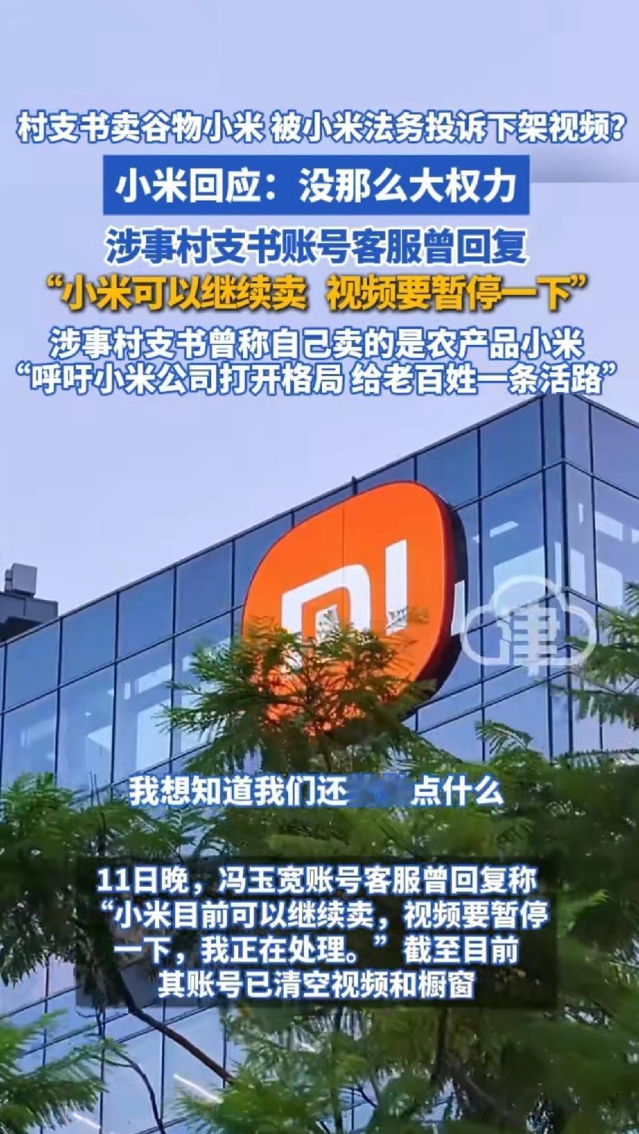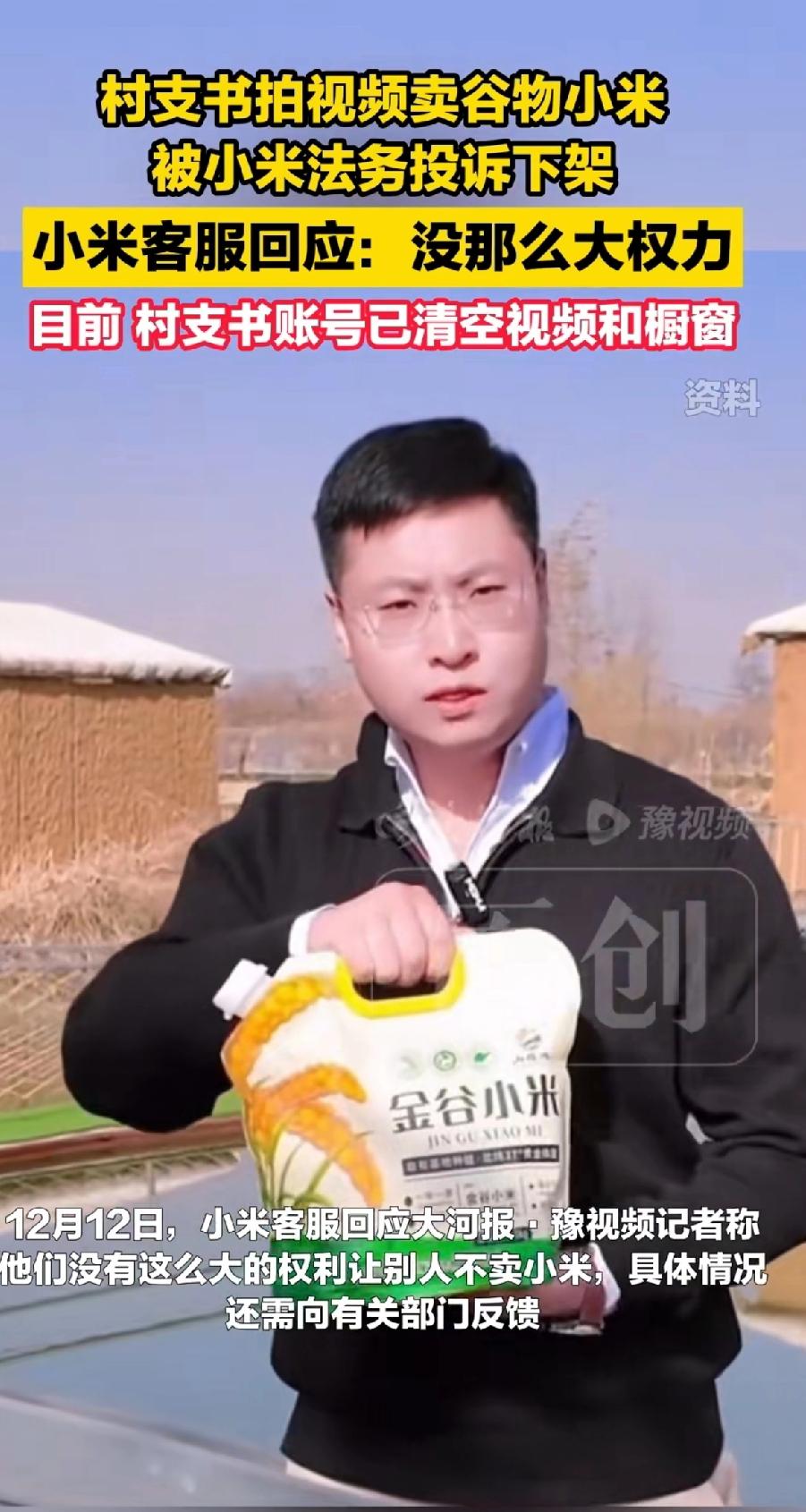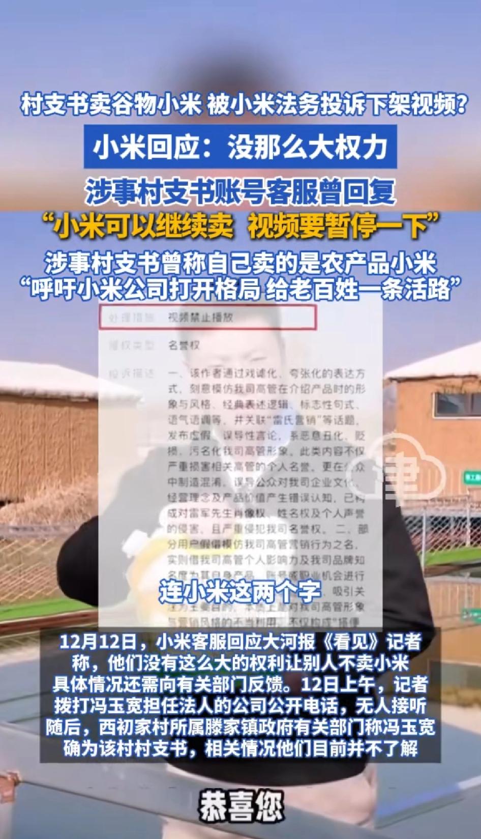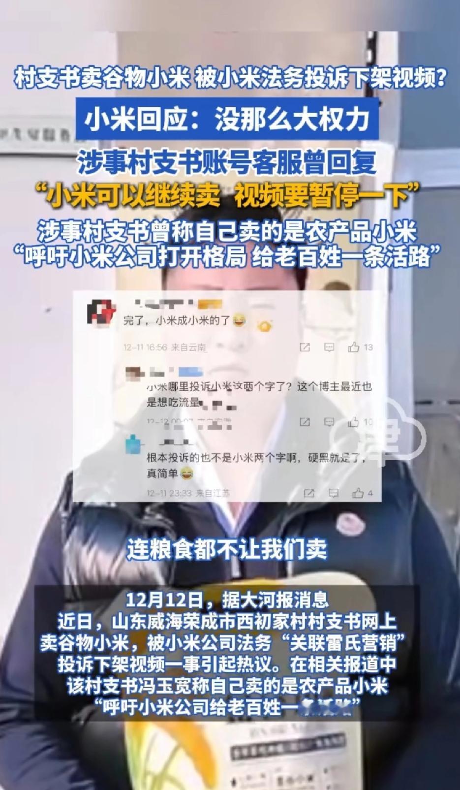 山东威海荣城村支书,因卖小米事件闹得沸沸扬扬。 村支书冯玉宽在网上卖谷物小米,却被小米公司法务以“关联雷氏营销”投诉下架视频。 冯支书称自己卖的是农产品,小米就是农产品呀,卖小米不让叫小米,就是霸权主义。 呼吁小米给老百姓条活路。 12 月 12 日小米客服回应没那么大权力让人不卖小米。 11 日晚其账号客服说小米能继续卖,视频先暂停处理。 目前,该账号已清空视频和橱窗。网友看法不一,有人觉得小米霸道,也有人指出村支书模仿雷军开发布会形式可能侵权。 这位村支书特意发道歉视频,不道歉大家还不知道,这一道歉反而让米农有了活路。