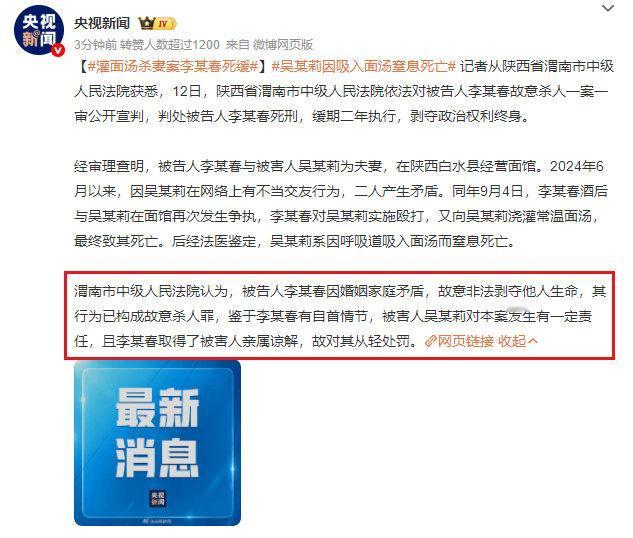 灌面汤杀妻案一审宣判:丈夫李某春被判死缓! 2025年12月12日,陕西“灌面