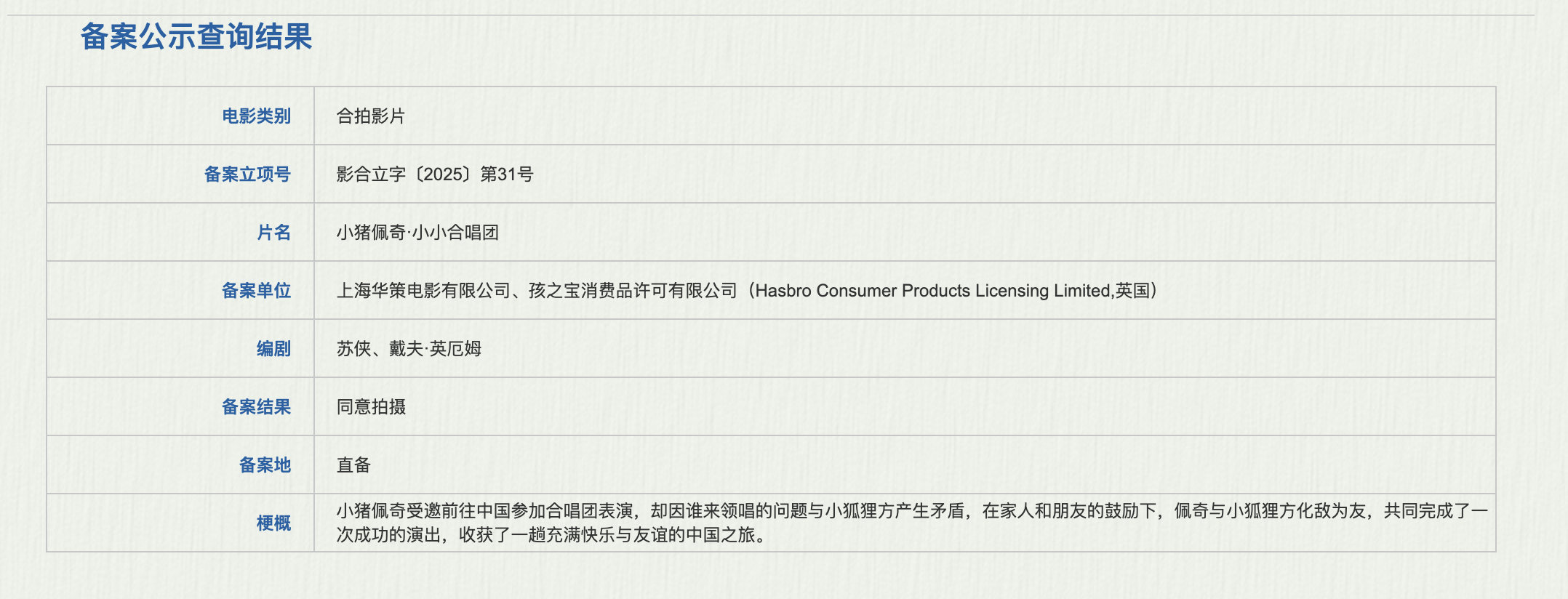 《小猪佩奇》备案立项新的合拍影片《小猪佩奇•小小合唱团》,由上海华策电影有限公司和孩之宝消费品许可有限公司合作。梗概:小猪佩奇受邀前往中国参加合唱团表演,却因谁来领唱的问题与小狐狸方产生矛盾,在家人和朋友的鼓励下,佩奇与小狐狸方化敌为友,共同完成了一次成功的演出,收获了一趟充满快乐与友谊的中国之旅。