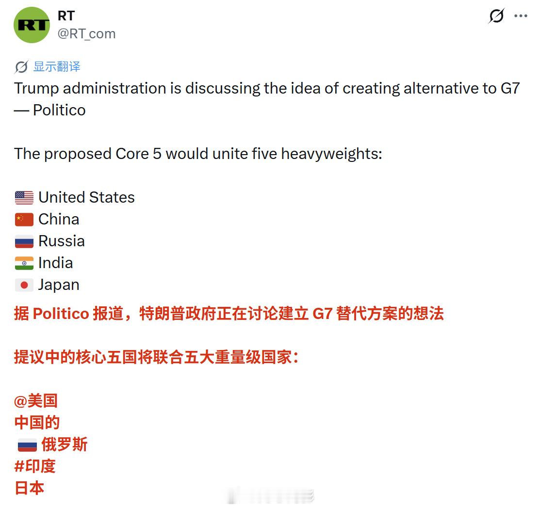 继倡导G2之后,特朗普政府又打算联合中俄印日成立“核心五国”C5!前一段时间,特朗普曾在社交媒体发文表示想要拉拢东大组成G2,引起了不小的热议。而近日“观察者网”等媒体又引述美国媒体的报道称,特朗普还曾提议“舍弃”七国集团(G7),创建一个新的主要大国组织——“核心五国”(Core 5,C5),成员国包括美、中、俄、印、日,不带欧盟诸国玩了。话说,这次特朗普提议的新组织包括了印度,想必印度网友应该很高兴了吧,不过我们大概率不会跟的……美国想和中俄印日组建核心五国烽火问鼎计划热点观点