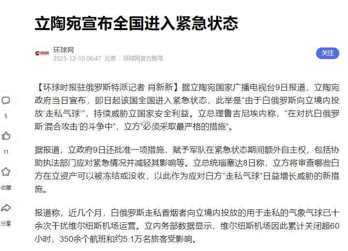 立陶宛总统瑙塞达已经瑟瑟发抖。据报道,立陶宛政府宣布全国进入国家紧急状态,理由是所谓的“携带违禁品的气球从白俄罗斯放飞至立陶宛境内”。 这事乍一听像那么回事,总理鲁吉尼埃内更是把调子定得老高,说这是白俄罗斯发起的“混合攻击”,必须下狠手反击。 可真扒开来看,所谓的“国家安全危机”,压根就是把芝麻大点的事吹成了西瓜。 立陶宛自己公布的数据显示,今年确实有599个气象气球和197架无人机飘进过他们领空,但这些东西既不是导弹也不是间谍设备,说白了就是走私犯用的“空中快递”。 这些气球确实添了乱,最直接的就是让机场遭了殃。 首都维尔纽斯机场前前后后关了快60小时,320多个航班延误,5.1万名旅客被堵在航站楼里动弹不得,芬兰航空干脆把到明年2月的所有晚间航班都取消了,就怕气球影响飞行安全。 但要说这点麻烦就能让一个国家启动紧急状态,实在是小题大做。 更有意思的是,调查发现气球上装的SIM卡,全是立陶宛、波兰这些国家运营商的,这就露馅了,走私网络的根儿压根就在波罗的海三国自己这边。 白俄罗斯总统卢卡申科说得一点没毛病,这就是立陶宛故意把民间走私政治化,纯属没事找事。 瑙塞达之所以这么折腾,说白了就是家里的烂摊子实在捂不住了,只能靠制造外部敌人来转移注意力。 这个国土面积才6.53万平方公里、人口不到300万的小国,军队满打满算也就2.1万人,夹在欧盟、俄罗斯和白俄罗斯中间,本该稳稳当当过日子,可这些年净干些“跳脚”的事。 为了讨好美国和欧盟,高调搞涉台小动作,结果被中国一顿反制,经济直接摔了大跟头。 中欧班列改道后港口吞吐量暴跌40%,百年历史的乳业关了三条生产线,牛奶卖不出去只能往沟里倒,木材出口一年8000万美元的收入直接归零,1300多家中小企业说倒就倒。 后来又一门心思跟着北约反俄,给乌克兰送武器递物资,把周边邻居全得罪光了。 瑙塞达的小算盘其实是要北约来给自己撑腰,立陶宛的地理位置特殊,苏瓦乌基走廊是北约和波罗的海三国唯一的陆上联系,可这里俄罗斯的军事力量是北约的8倍,本就是块软肋。 他把“威胁”喊得越响,就越能让北约把军队、武器部署过来,还能多要些援助。为了留住美军,立陶宛特意花700万欧元修了个设施一流的基地,就盼着美军能永久驻扎。 可现实很快就给了他一记响亮的耳光。紧急状态刚宣布,白俄罗斯反手就来了招“釜底抽薪”,禁止立陶宛卡车过境,瞬间就把1100多辆立陶宛卡车堵在了边境。 要知道,立陶宛30%的乳制品出口都得靠白俄罗斯的过境通道,这一下奶农们直接哭晕在牧场。 光滞留卡车每天给立陶宛运输企业造成的损失就有22万欧元,再加上机场关闭带来的75万欧元直接损失,物流延误、旅游订单流失的隐性损失更是没法算。 之前得罪中国已经让外贸半残,现在又把白俄罗斯惹毛了,国内不少工厂都快撑不下去了,瑙塞达能不发抖吗? 更让他没底的是,白俄罗斯背后还站着俄罗斯。这些年俄白联盟越走越近,联合军演一次接一次,军事力量根本不是立陶宛能比的。 卢卡申科早就放话了,白俄罗斯不想打仗,是立陶宛在故意挑事,还主动呼吁坐下来谈判。 这一下就把瑙塞达架在了火上,真谈吧,之前把话说得太满,下不来台;不谈吧,又怕真把俄白逼急了,那后果可不是几个气球能比的。 其实瑙塞达的“瑟瑟发抖”,从来都不是因为那几个走私气球,而是源于立陶宛内外交困的绝境。 自己没实力,还非要跟着别人当“出头鸟”,把邻居全得罪光,经济搞垮了,安全没保障,现在只能靠制造恐慌来掩盖无能。 国家之间的博弈,从来不是靠喊口号、搞炒作,实力才是硬道理。立陶宛这种拿国家命运当赌注的做法,最终只会搬起石头砸自己的脚。