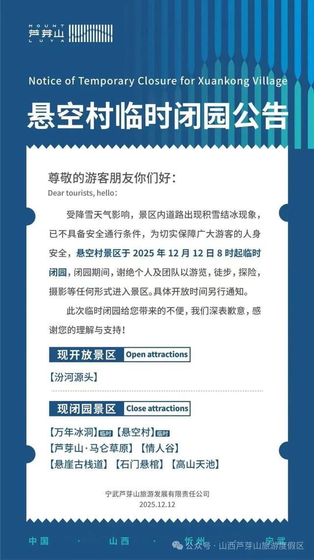 因受强降雪天气影响,恒山庙群区路面积雪结冰严重,为确保广大游客人身安全,即刻起恒山庙群区暂时封闭。恢复开放时间将在恒山景区微信公众号另行通知。