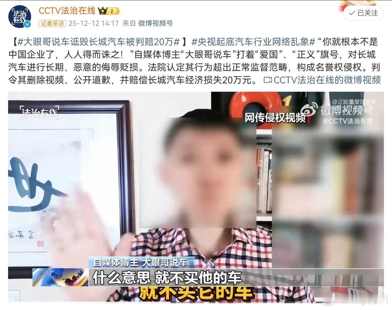 大眼哥说车怎么上央视了这是谁的部下?下一批上央视的是谁?有点期待警惕汽车行业饭圈化毒流量 央视起底汽车行业网络乱象 大眼哥说车诋毁长城汽车被判赔20万