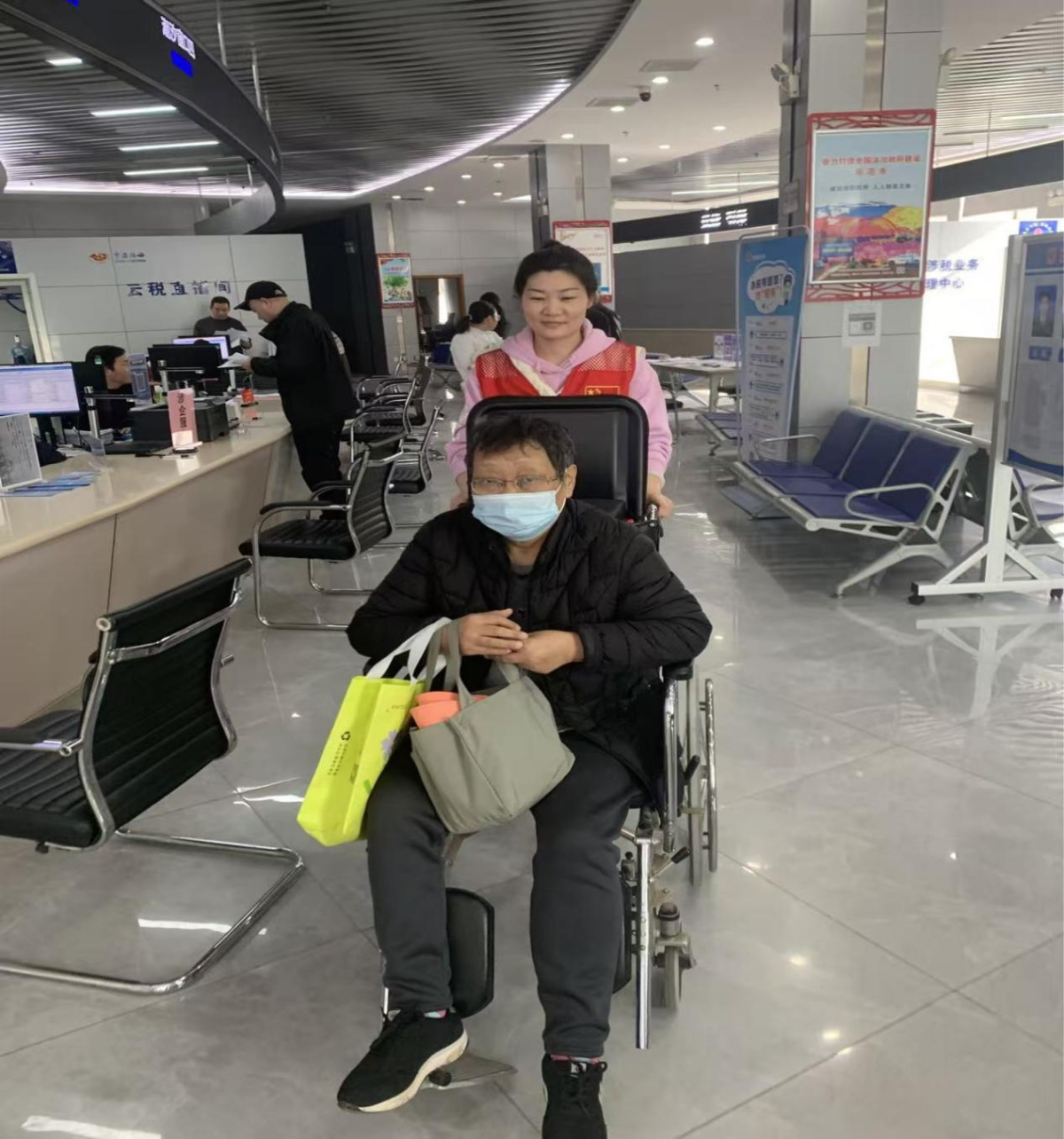 近日,市民张先生到郾城区政务服务大厅补办结婚证,由于腿部疾病行动不便,走路艰难,大厅的志愿者看到后,急忙推出大厅轮椅上前帮助,并及时询问需要办理的业务。随后,志愿者一直陪同张先生到二楼业务窗口办理相关业务,并及时帮助张先生整理资料、复印证件,仅仅用了十多分钟就完成了证件补办。