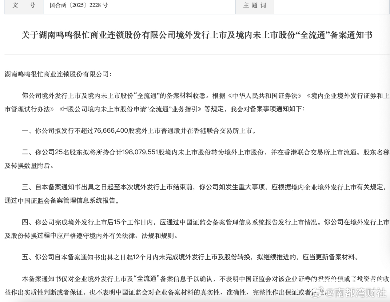 #鸣鸣很忙赴港上市通过证监会备案#【量贩零食连锁“一哥”#鸣鸣很忙将赴港上市#,通过证监会备案】12月11日,中国证监会国际合作司发布的《关于湖南鸣鸣很忙商业连锁股份有限公司境外发行上市及境内未上市股份“全流通”备案通知书》显示,量贩零食企业鸣鸣很忙上市备案已获通过。 据上述备案通知书,鸣鸣很忙拟发行不超过7666.64万股境外上市普通股并在港交所上市,25名股东拟将所持合计约1.98亿股境内未上市股份转为境外上市股份,并在港交所上市流通。据悉,2025年4月28日,鸣鸣很忙首次向港交所递交上市申请。10月28日,公司更新上市申请材料,继续推进上市进程。作为中国最大的量贩零食连锁零售商,鸣鸣很忙通过“零食很忙”与“赵一鸣零食”双品牌深度融合,整合经营体系与统一组织架构,实现无缝协同与标准化运营,以集团化运营提升供应链与运营效率。据中国连锁经营协会数据,鸣鸣很忙跻身2024年中国连锁行业前10,是其中唯一来自量贩零食赛道的企业。10月28日,鸣鸣很忙向港交所提交更新后的上市申请材料。数据显示,截至2025年上半年,公司实现零售额(GMV)411亿元人民币,上半年收入为281.2亿元人民币,经调整净利润为10.34亿元人民币,门店总数已达16783家,覆盖全国28个省份、1327个县等市场。 经营质量方面,截至2025年上半年,鸣鸣很忙期末现金余额超23.94亿元,流动资产净值增至28.27亿元,现金充足,资产流转高效,财务结构稳健。2025年上半年经营现金流净额为13.95亿元。2025年9月,据第三方权威机构弗若斯特沙利文认证,鸣鸣很忙成为行业首家突破2万店的企业。(南都N视频记者 黄培)
