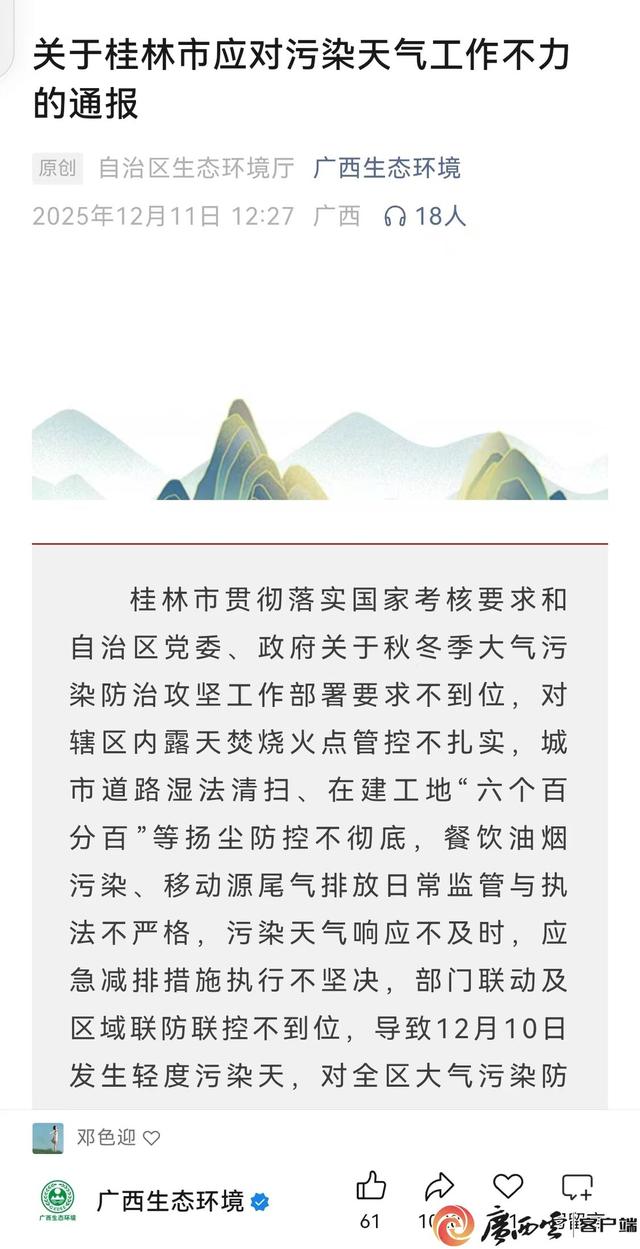 12月11日,自治区生态环境厅官方微信公众号“广西生态环境”发布桂林市被通报情况的截图。