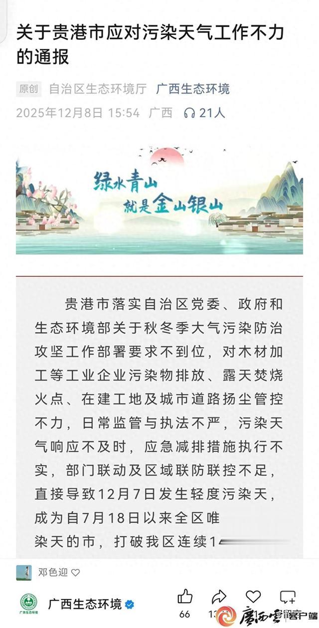 12月8日,自治区生态环境厅官方微信公众号“广西生态环境”发布贵港市被通报情况的截图。