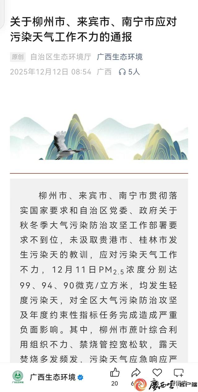 12月12日,自治区生态环境厅官方微信公众号“广西生态环境”发布柳州、来宾、南宁被通报情况的截图。