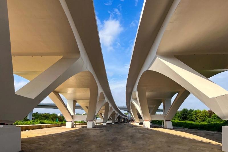 梧桐路三号桥横跨中央公园,连接樱花路与竹山屋路,全长590米,采用双幅桥体设计,单幅桥宽17米,桥面按双向6车道标准建设,是连通中央公园东西两侧梧桐路的核心枢纽工程。作为梅溪湖二期立体路网骨架的重要组成部分,该桥梁的建成标志着片区东西向交通主动脉的关键节点全面贯通,将有效补全梅溪湖路网体系。