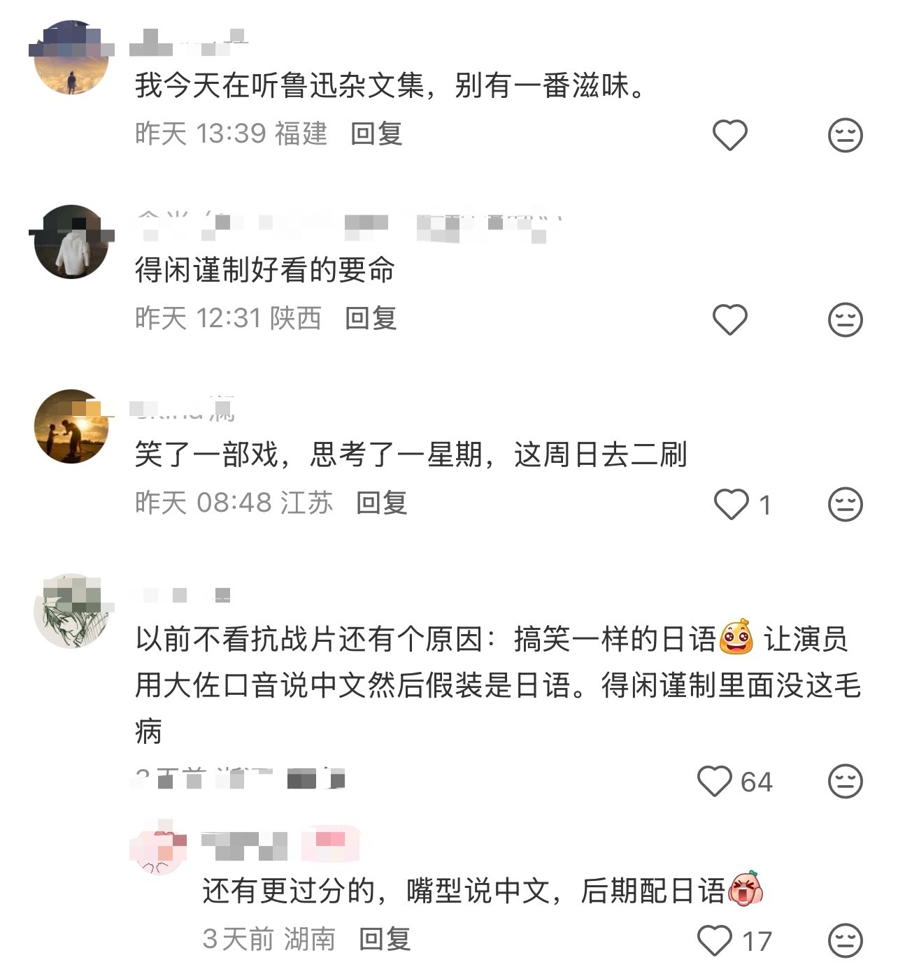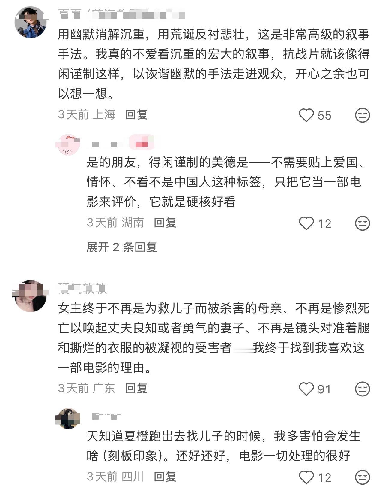 得闲谨制打破抗日题材观影限制!被传统抗战片的刻板印象影响的观众,抗日精神在这部电影里得到了释放!得闲谨制的女性跑出去可以是为了救人和反抗,日军的残忍是连一条狗都不放过的变态心理。不聚焦苦难!没有凌辱镜头!不刻意升华!不教育观众!让观众陪着角色苦中作乐的同时,反思我们人民群众在敌人来临时,应该怎么做!这才是我们死老百姓应该看的电影啊!得闲谨制年度最佳影片!