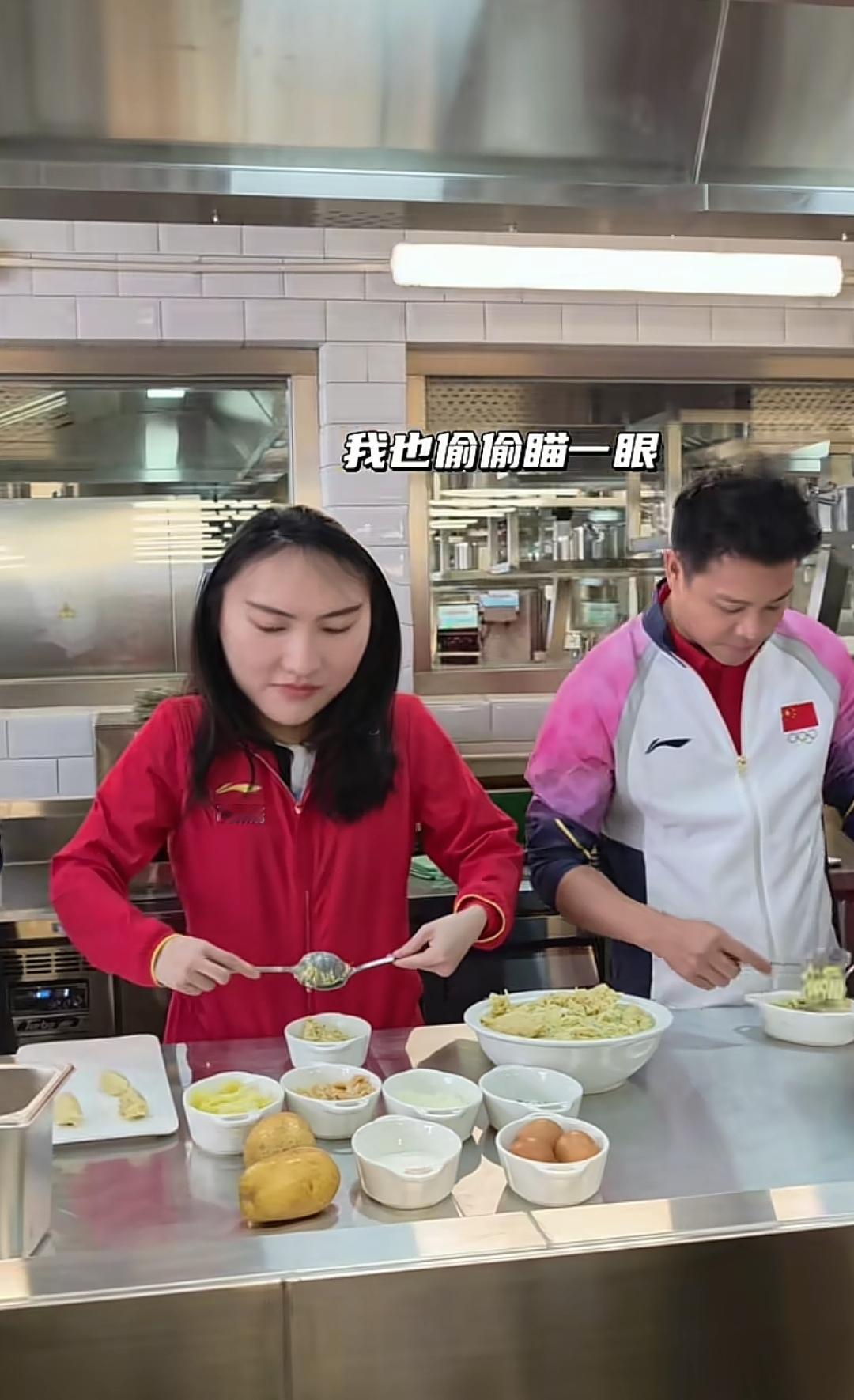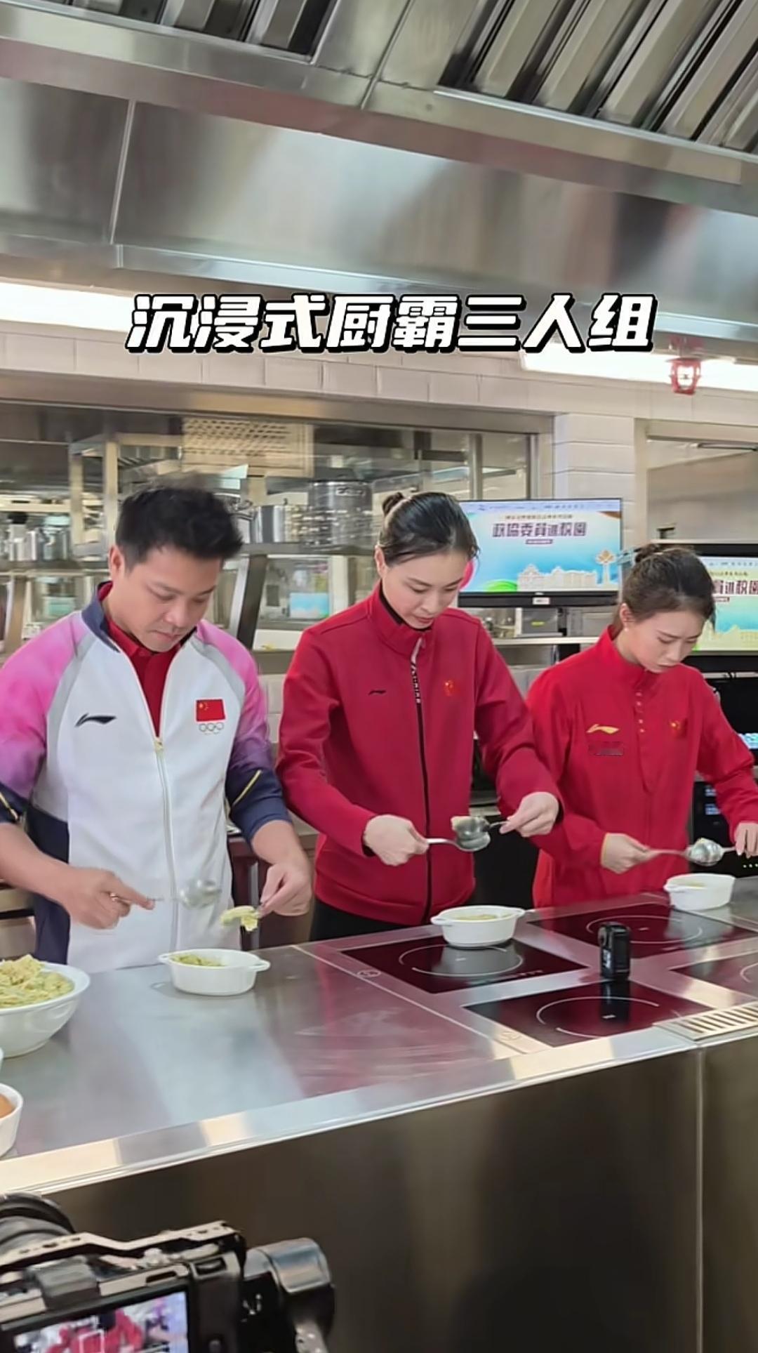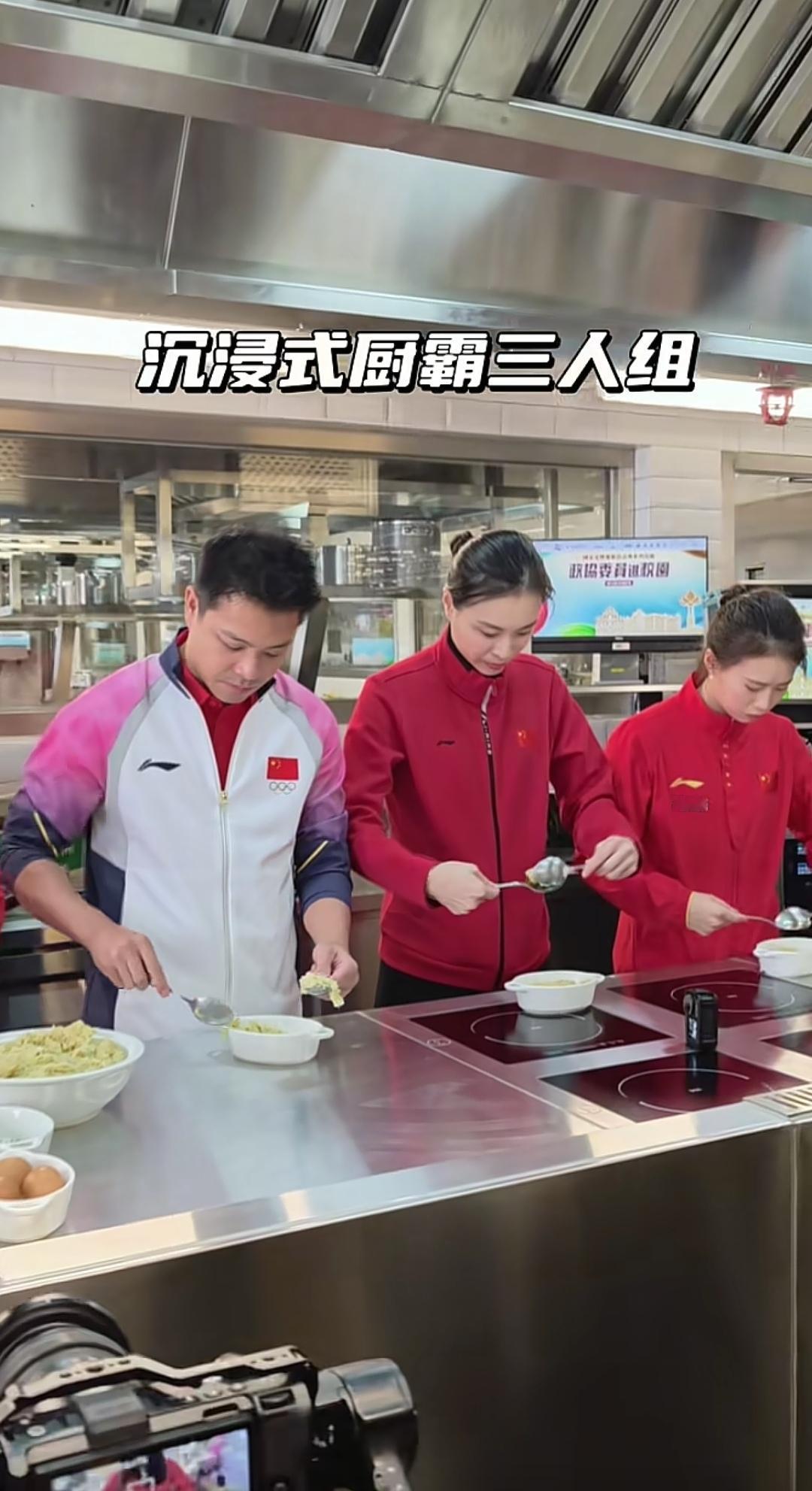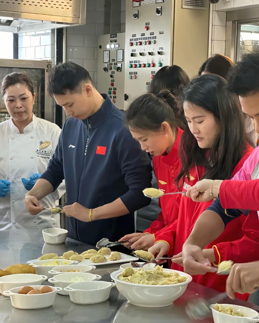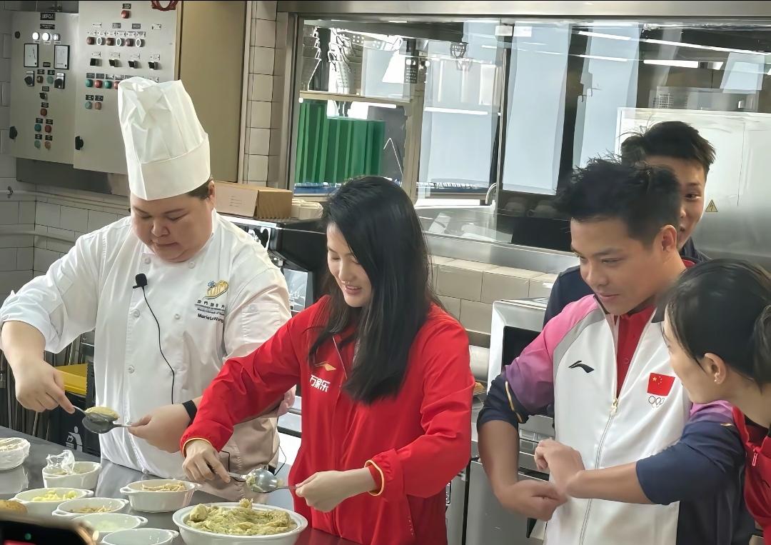 陈若琳、陈芋汐和吴敏霞等这次到澳门还去了厨房,一起做土式葡菜,一起感受做饭的乐趣。 在女厨师进行示范后,陈若琳的动作最娴熟,用两个勺子一起揉团,吴敏霞做的也可以,因为有女儿的原因,可能经常做饭。两位男运动员就显得比较笨拙一些,相互之间也是偷偷瞄一眼,陈芋汐也是认真做。 陈若琳、吴敏霞和陈芋汐还在厨房一起吃了葡式蛋挞,陈芋汐拿着浅蓝底色手机进行自拍。 陈芋汐这次去澳门也进行了精心打扮,戴着耳钉,指甲也进行了美甲。
