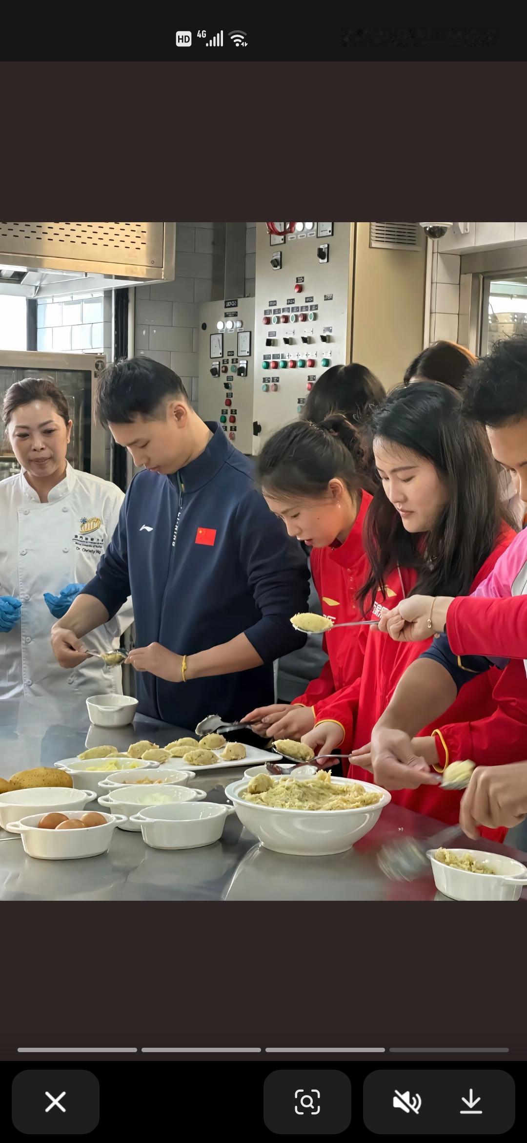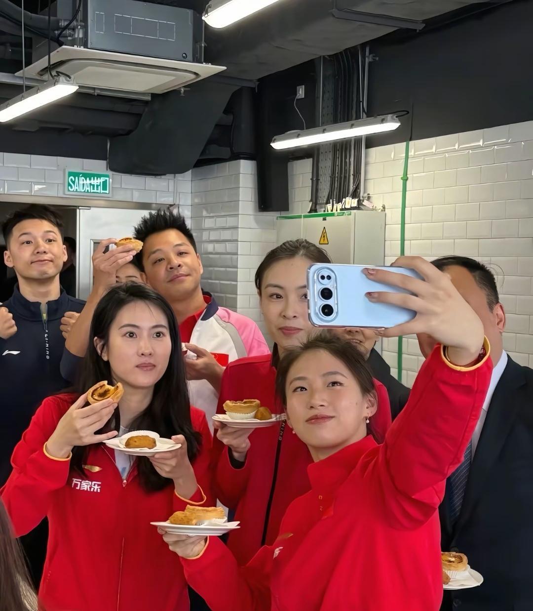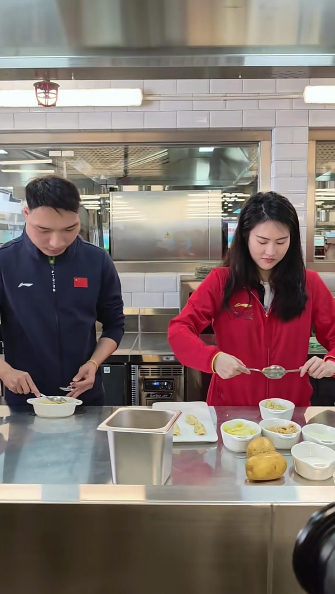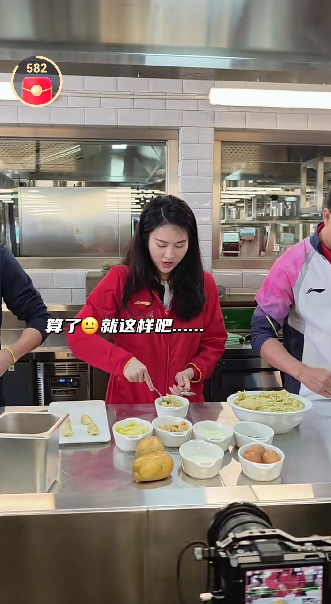 陈若琳、陈芋汐和吴敏霞等这次到澳门还去了厨房,一起做土式葡菜,一起感受做饭的乐趣。 在女厨师进行示范后,陈若琳的动作最娴熟,用两个勺子一起揉团,吴敏霞做的也可以,因为有女儿的原因,可能经常做饭。两位男运动员就显得比较笨拙一些,相互之间也是偷偷瞄一眼,陈芋汐也是认真做。 陈若琳、吴敏霞和陈芋汐还在厨房一起吃了葡式蛋挞,陈芋汐拿着浅蓝底色手机进行自拍。 陈芋汐这次去澳门也进行了精心打扮,戴着耳钉,指甲也进行了美甲。