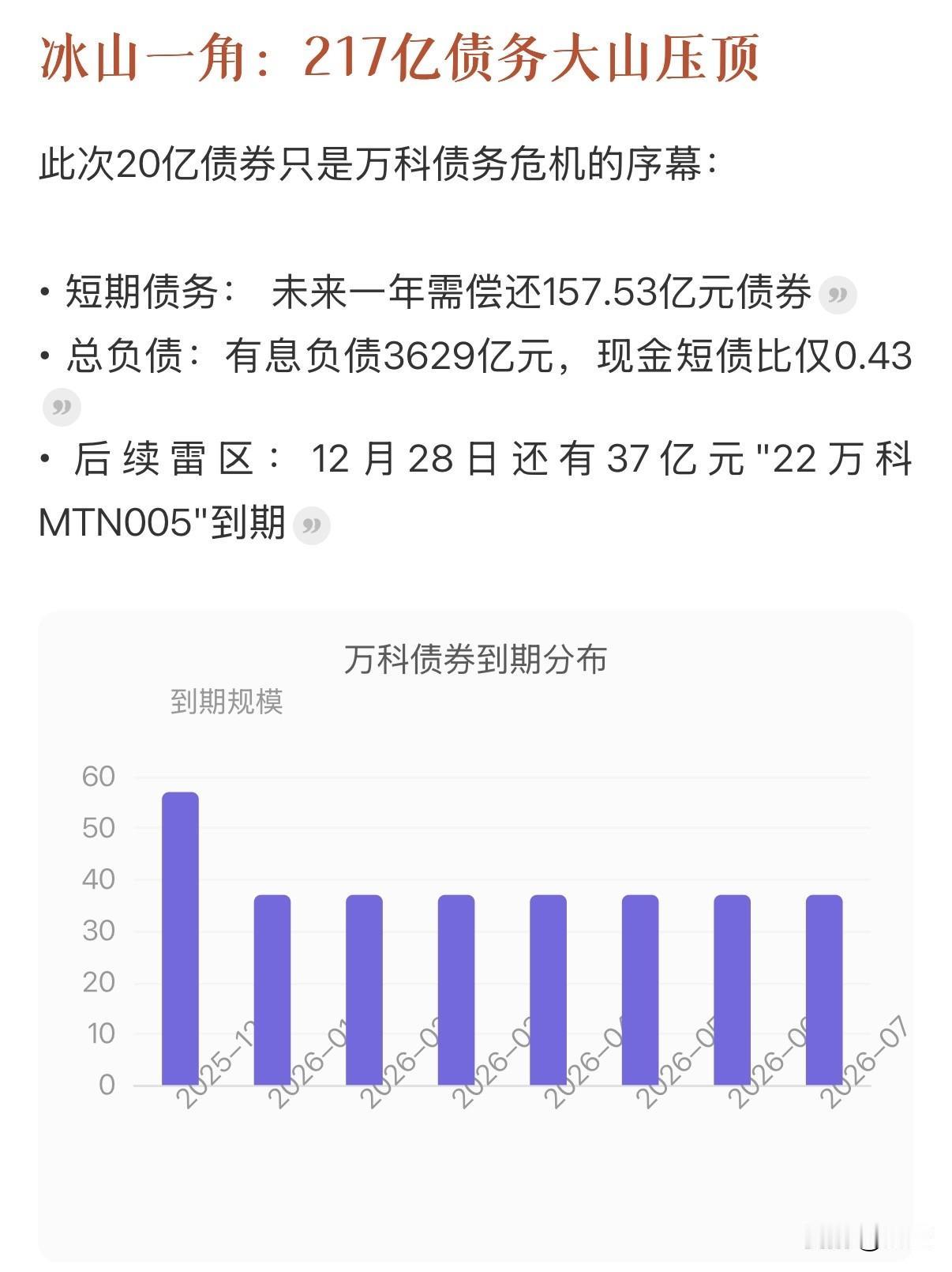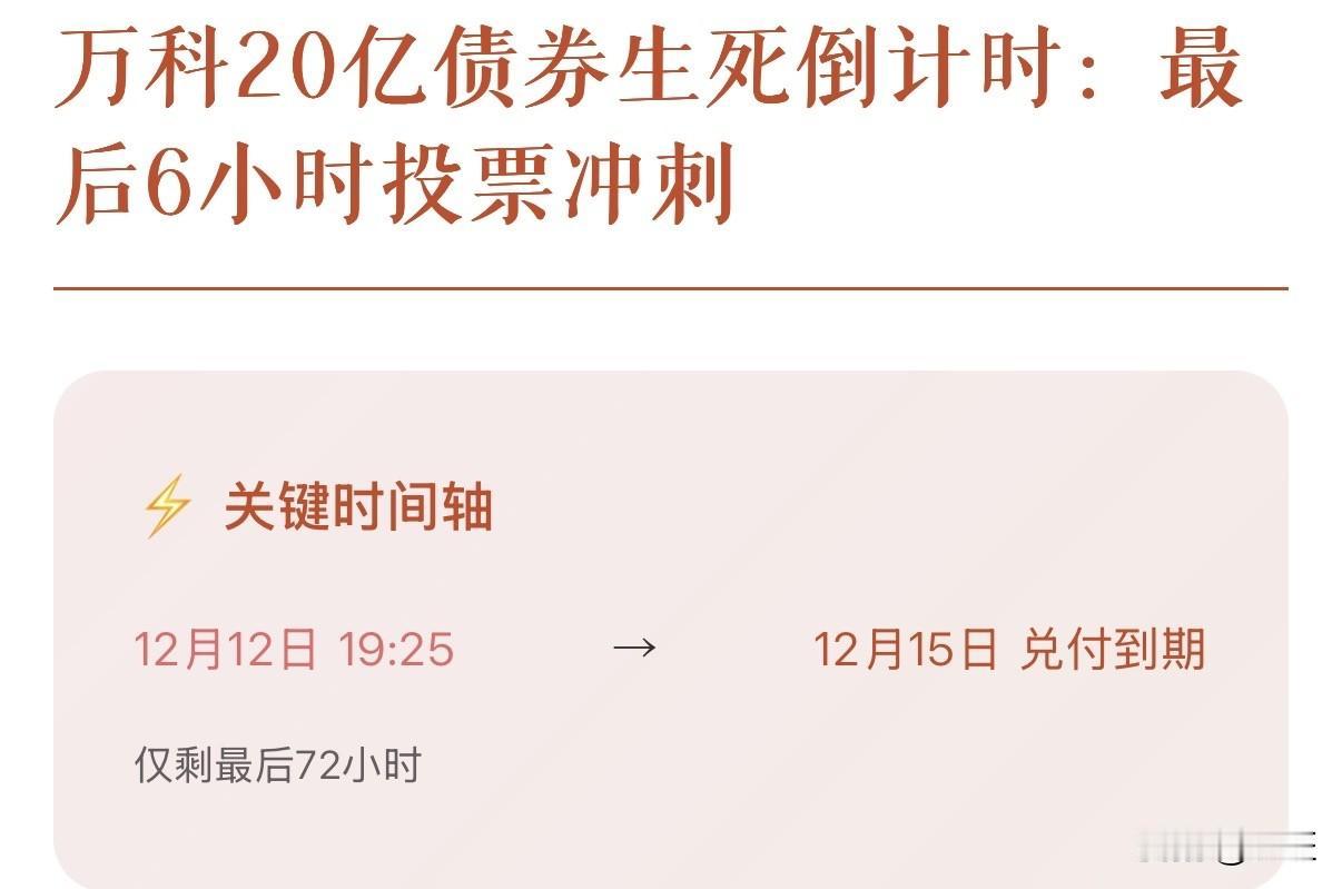 万科20亿债券生死倒计时:最后6小时投票冲刺,万科会退市吗? 12月12日 19:25→12月15日 兑付到期, 仅剩最后72小时, 投票僵局:90%门槛下的生死博弈, 截至12月12日19:25,万科正面临中国房地产史上最紧张的债券展期投票: • 已知反对票:至少3票明确反对(彭博社报道); • 通过门槛:需要90%债权人支持才能生效; • 投票截止:12月12日(今日)最后期限; • 兑付倒计时:12月15日20亿元到期,仅剩3天缓冲期。; 冰山一角:217亿债务大山压顶, 此次20亿债券只是万科债务危机的序幕: • 短期债务: 未来一年需偿还157.53亿元债券 • 总负债:有息负债3629亿元,现金短债比仅0.43 • 后续雷区:12月28日还有37亿元"22万科MTN005"到期。万科 万科资金困局 万科资金链 万科债务 万科现金流危机 a股万科