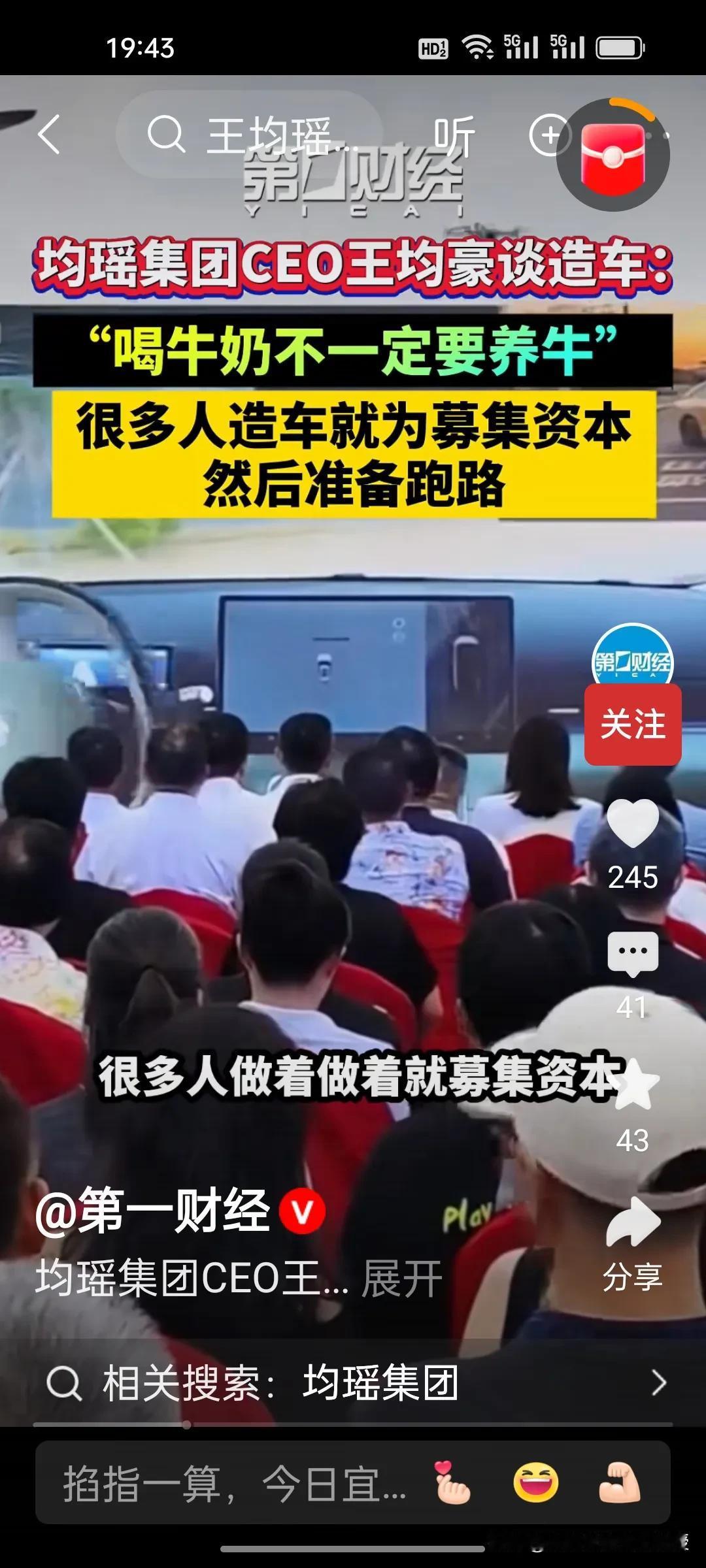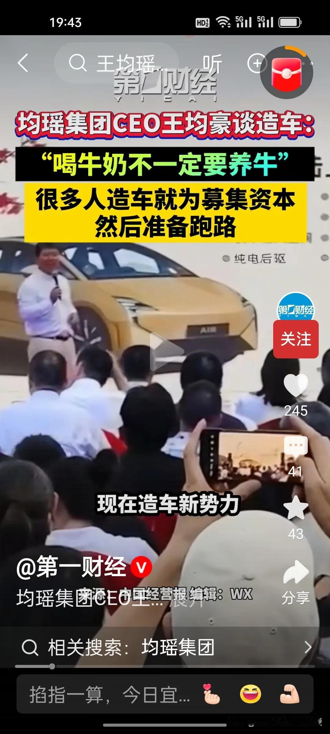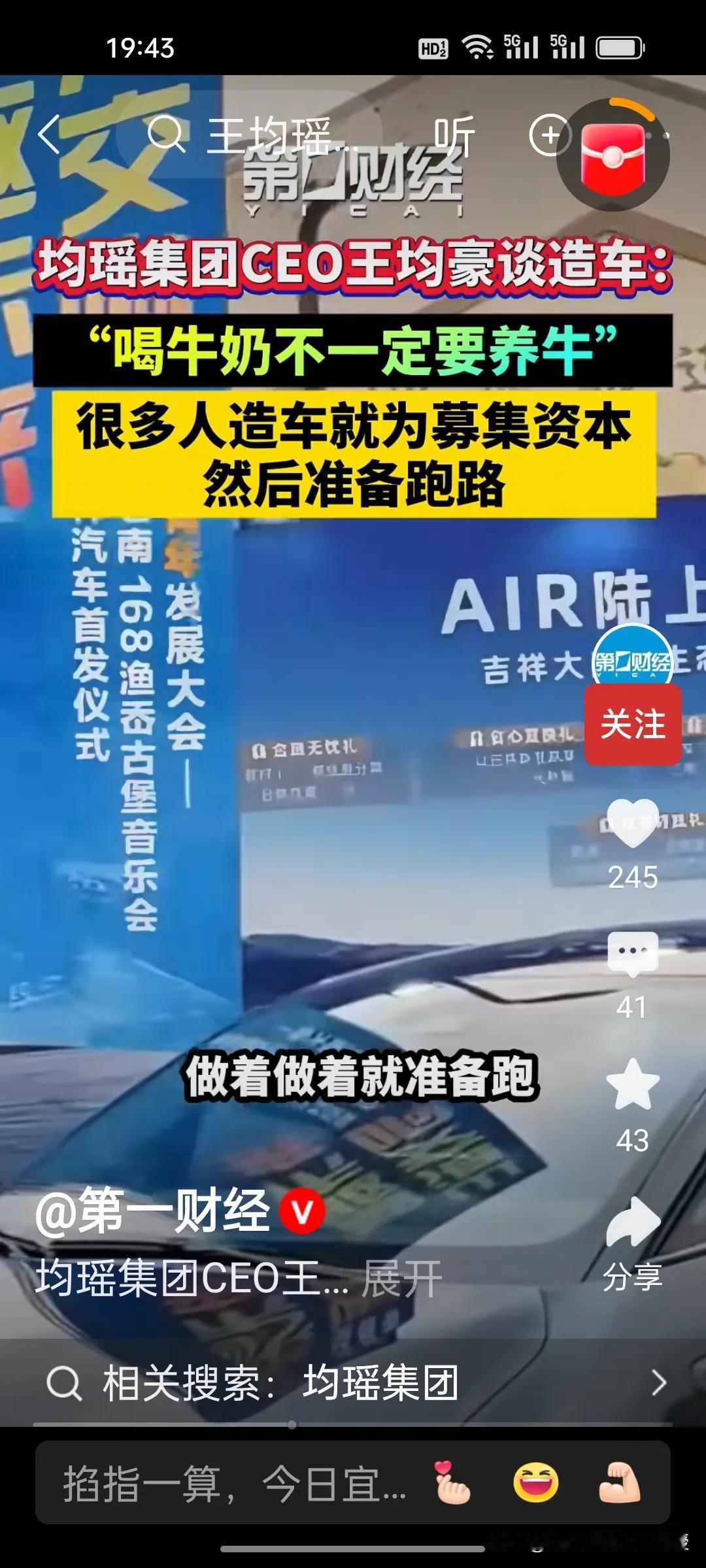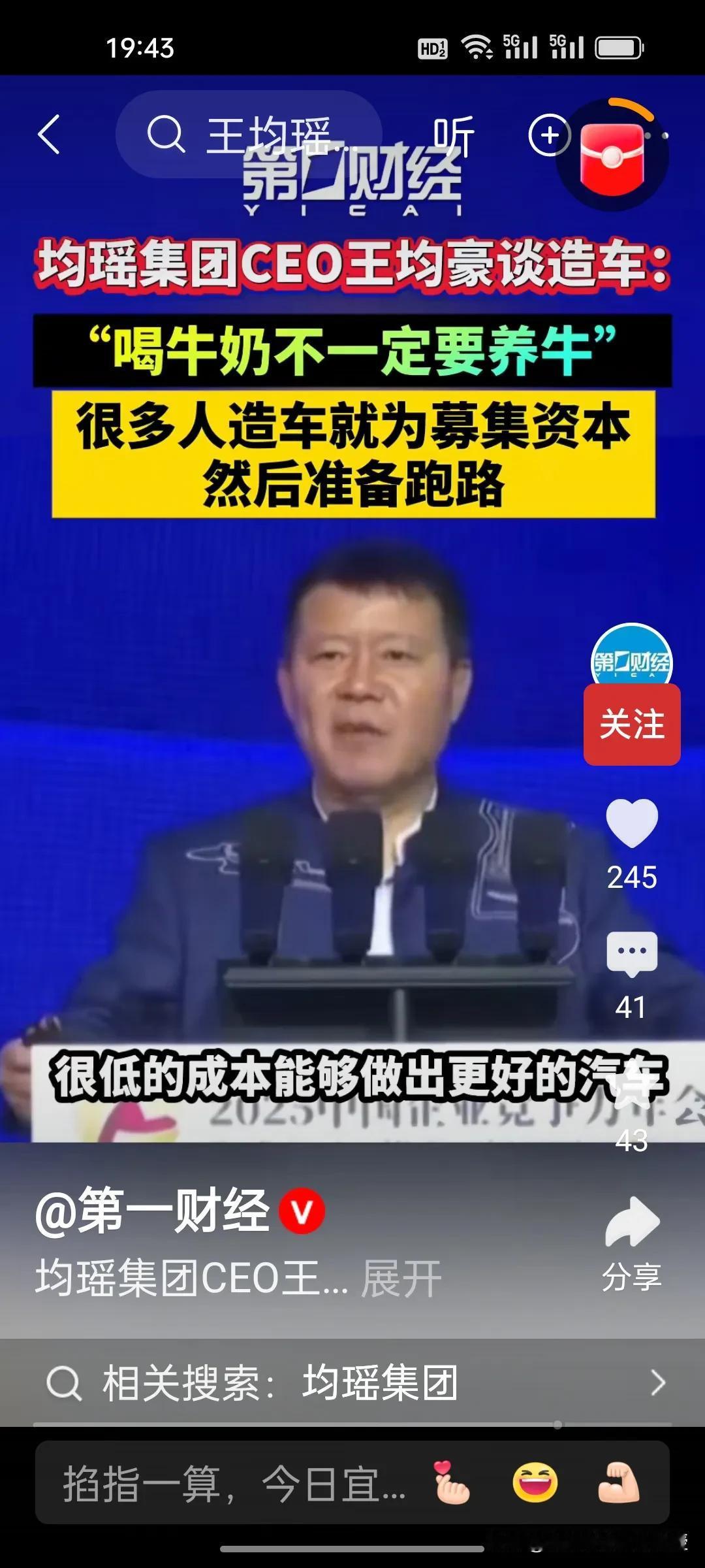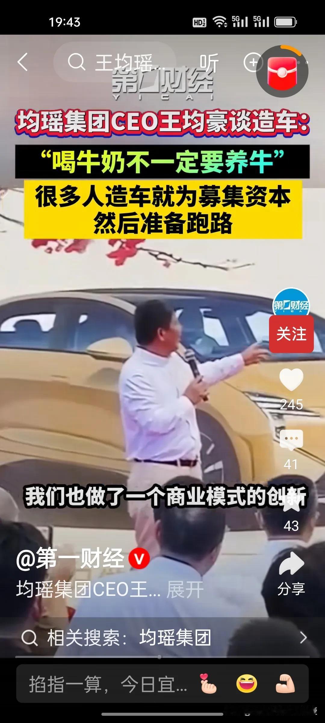 均瑶集团CEO王均豪真敢说啊!他在出席2025中国企业竞争力年会上发言说,很多造车新势力就是为了募集资本,然后准备跑路。均瑶的造车模式是轻资产模式。就像他说的“喝牛奶不一定要养牛”,专注研发和营销,委托车企生产,不搞重资产烧钱,主打低成本创新。 其实均瑶这种模式就是京东的模式,京东跟广汽,宁德时代合作,目前已经量产。京东就负责营销和售后。这样各司其职的轻资产模式,大规模节约成本,是未来新品牌的新能源汽车主要发展模式。 以后要是看见老干妈,茅台造车也不要觉得奇怪,只是企业多了一条利润增长曲线。