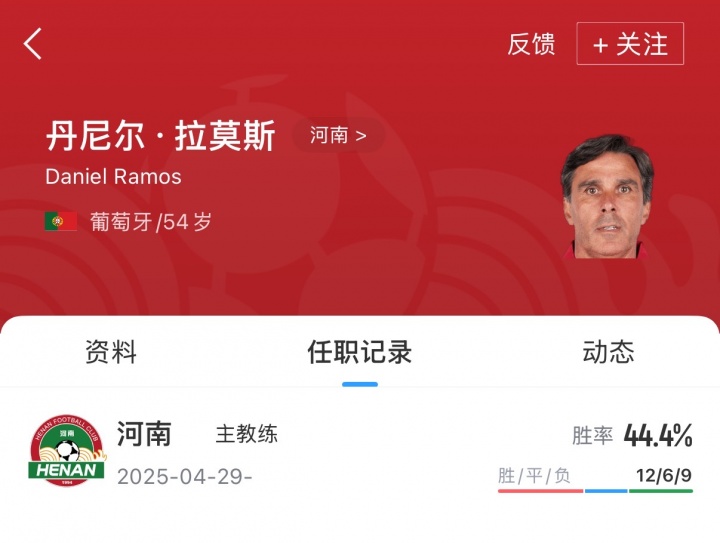 丹尼尔·拉莫斯今年4月29日接手河南队,带队取得12胜6平9负的战绩,河南队中超最终37分排名第10。河南队已于11月与拉莫斯完成续约。